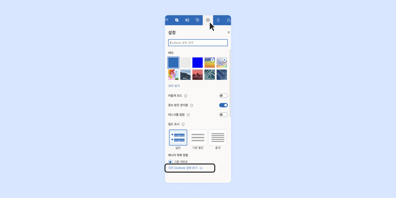 우측 상단의 [설정] - [모든 Outlook 설정 보기]를 클릭해주세요.
