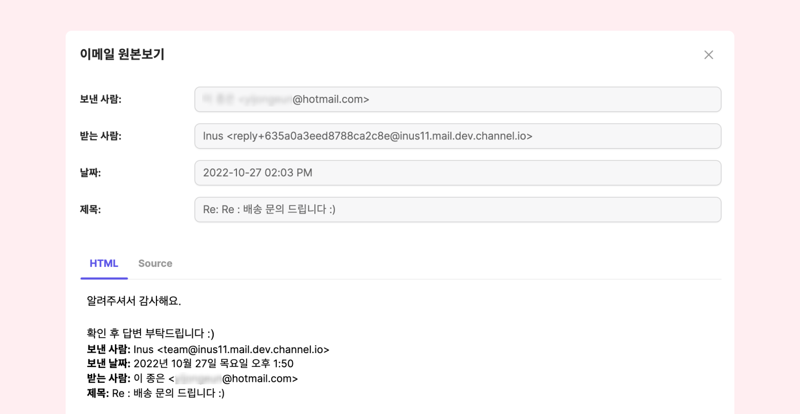 이메일 원본보기를 사용하면 테이블, css 스타일링 등 이메일 클라이언트에서 보이는 형태와 유사한 모습을 확인할 수 있습니다. HTML와 Source 두가지 정보를 함께 제공합니다.