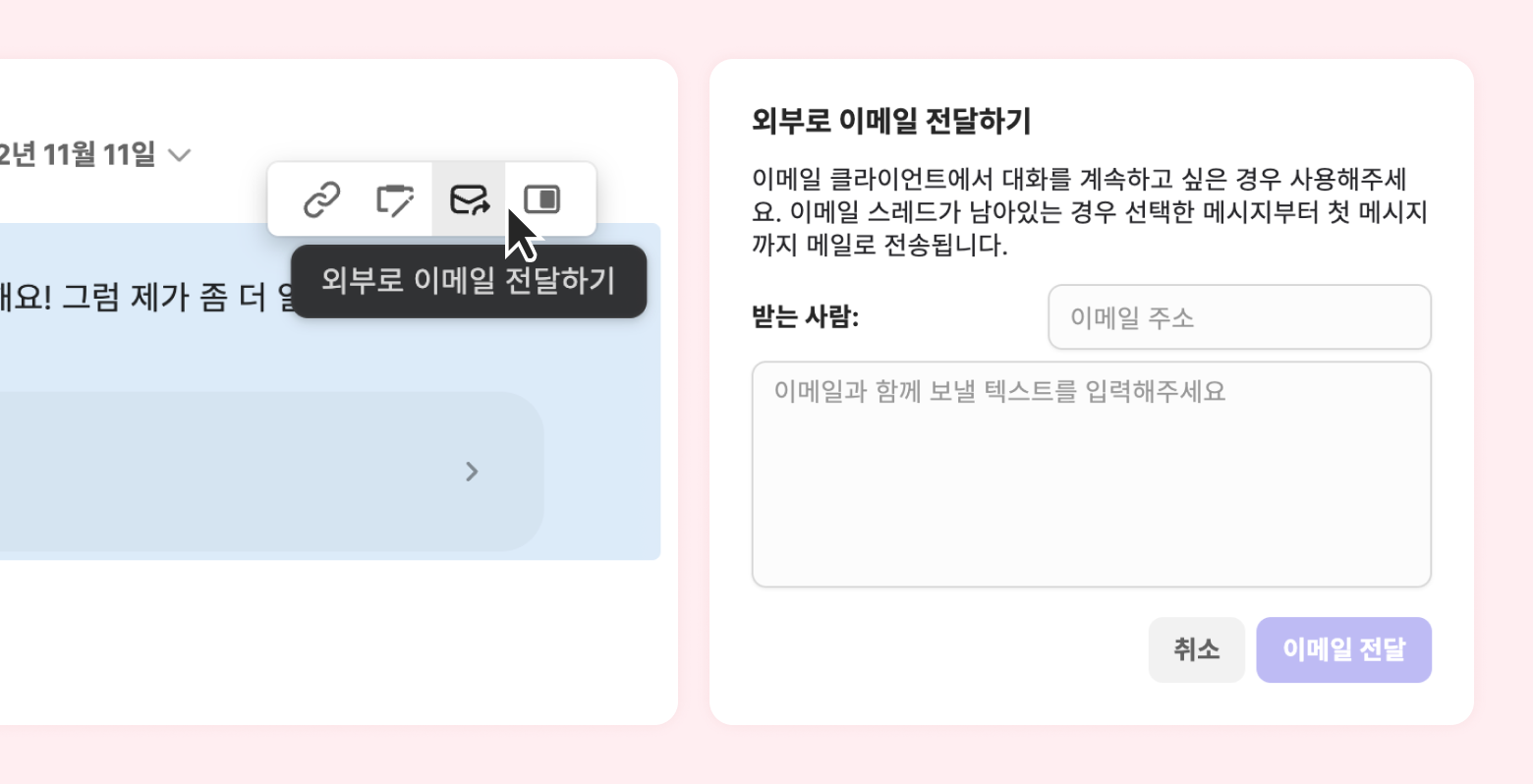 고객과 채널톡에서 주고받은 대화를 외부 이메일로 전달하고 싶을 때, 해당 기능을 사용해주세요.