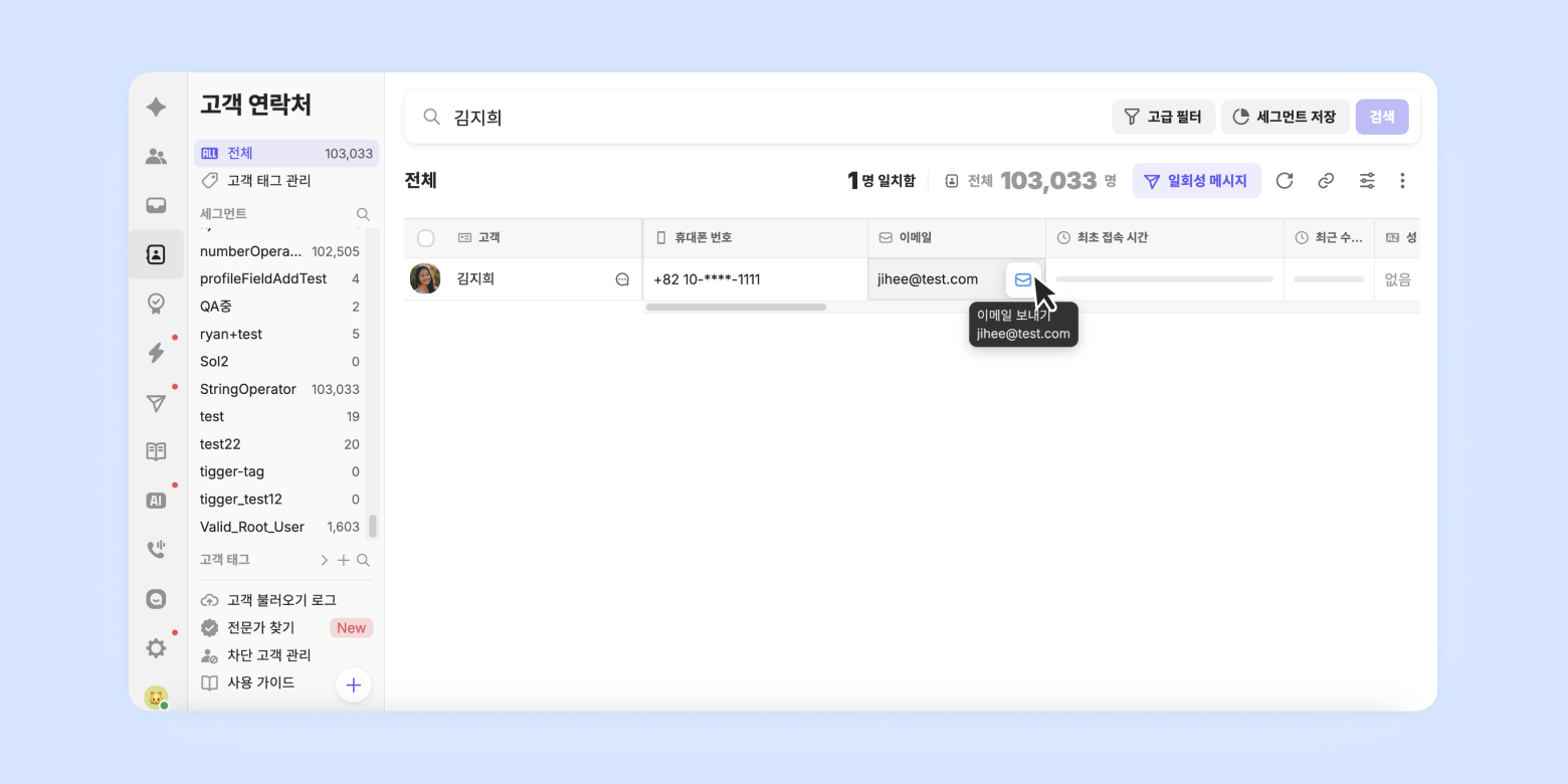 우측 고객 정보에서 '이메일'에 위에 마우스를 올리면 '이메일 보내기' 아이콘이 뜹니다. 이를 클릭하여 이메일을 보낼 수 있어요.