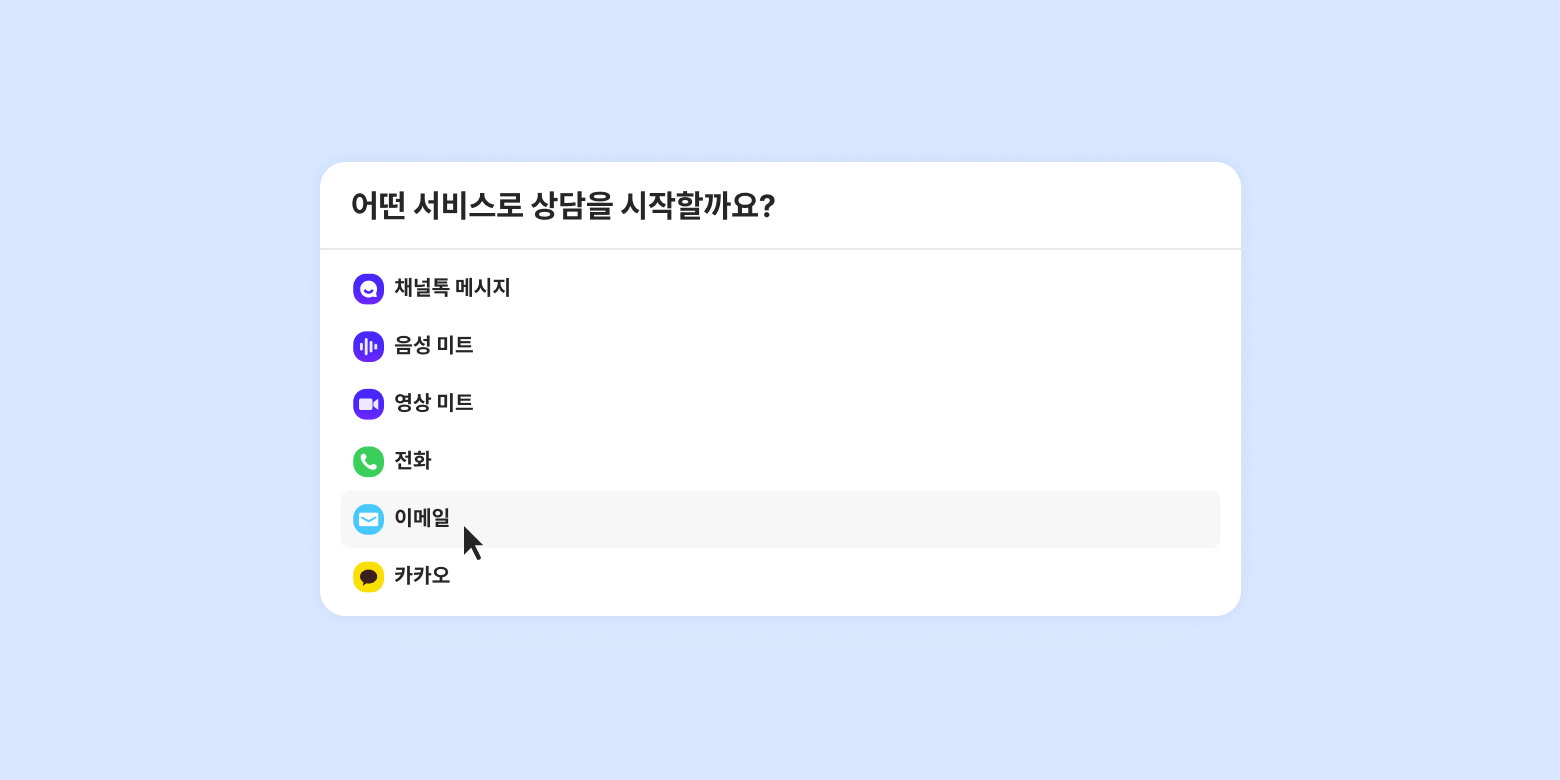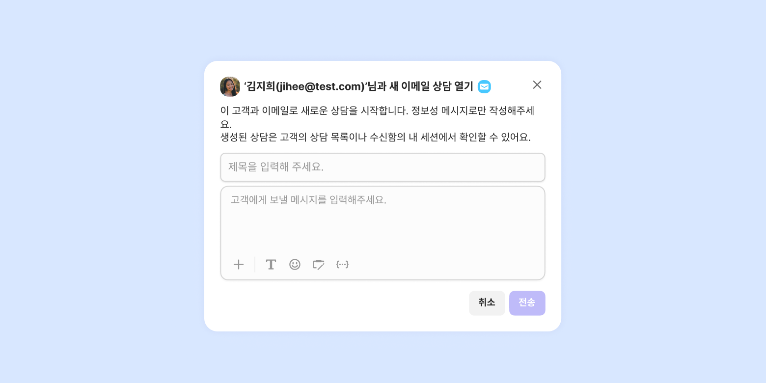 상담사는 고객 메일에 답장할 뿐 아니라, 먼저 이메일을 보낼 수도 있어요. 적절한 제목과 메시지를 입력해 상담을 시작해 보세요.