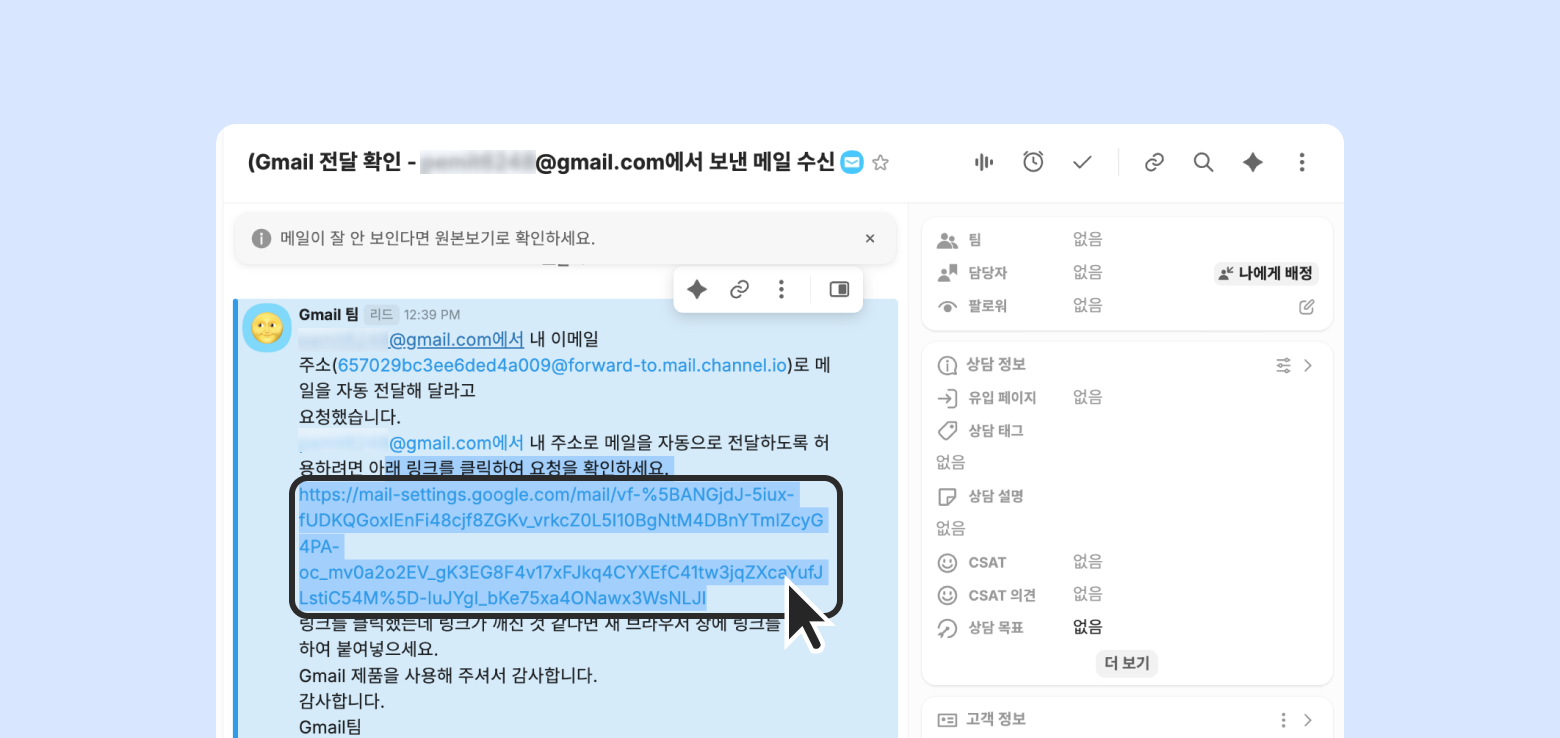 고객이 메일에 답변을 할 경우, 상담창으로 답변 메일이 전달됩니다.
