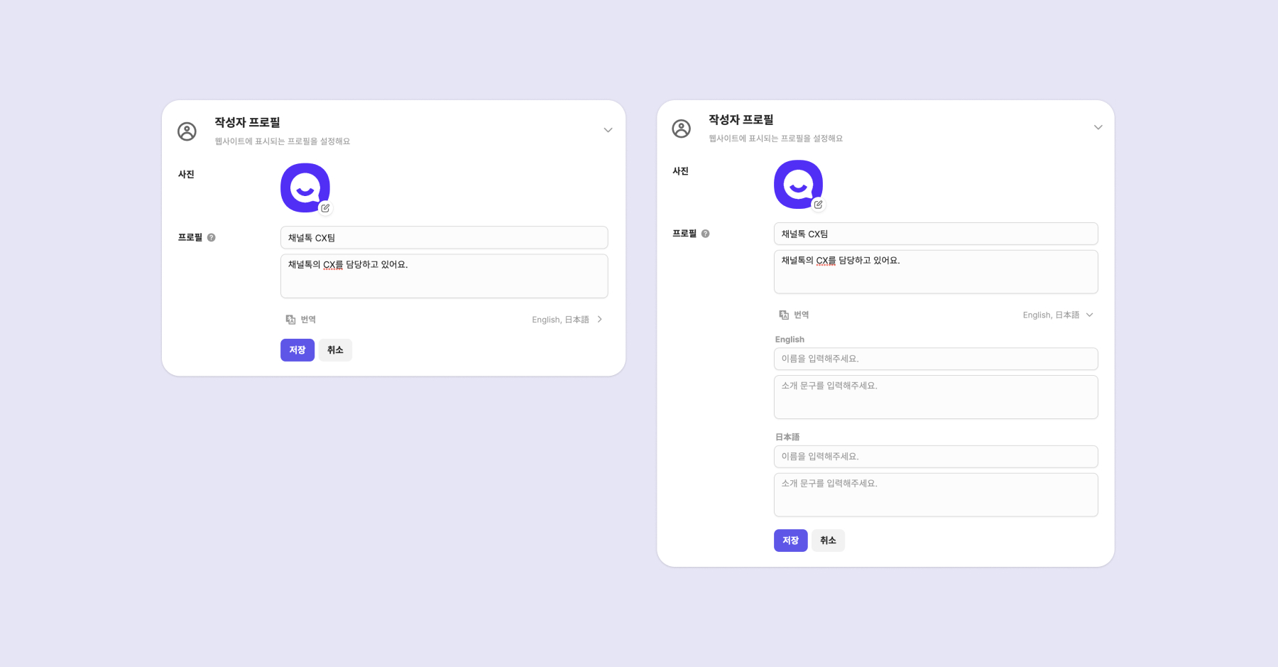 작성자 프로필은 스페이스별로 관리하며 팀 멤버별로 하나씩 생성돼요. 해당 스페이스가 지원하는 언어에 따라 이름 및 소개 문구의 번역 값을 입력해 보세요.