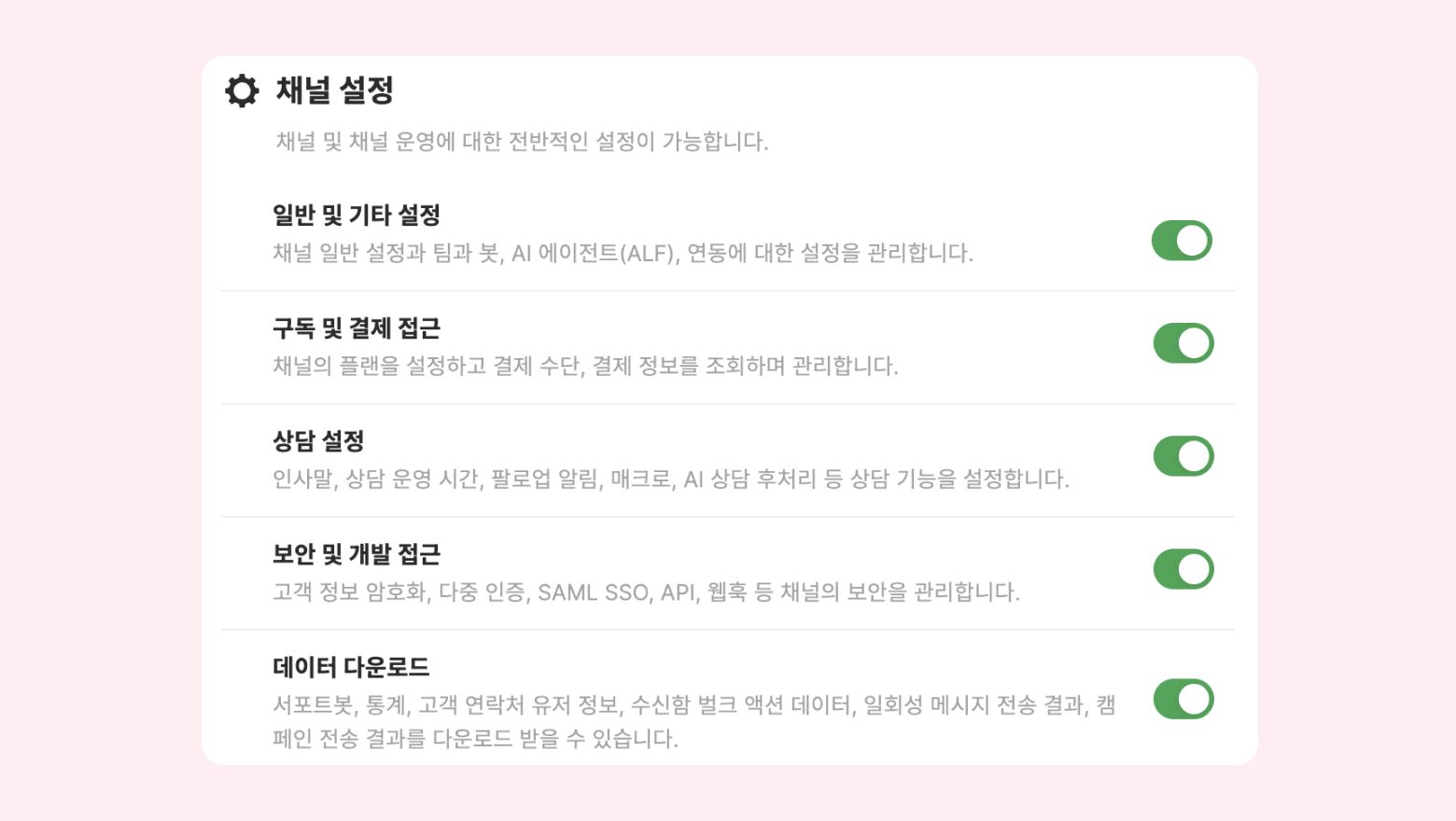 고객 정보 암호화, 다중 인증, SAML SSO, IP 주소 제한, 활동 로그, API, 웹훅 등 채널의 보안 관리