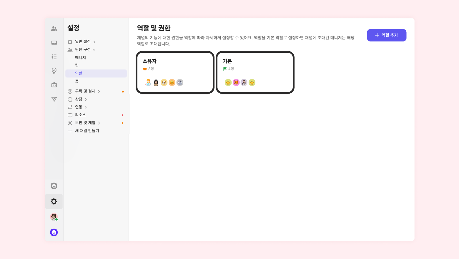 채널당 역할은 20개까지만 존재해요. 역할은 소유자 역할과 기본 역할이 있고, 권한들을 조합해 커스텀한 역할들을 별도로 생성할 수 있습니다.