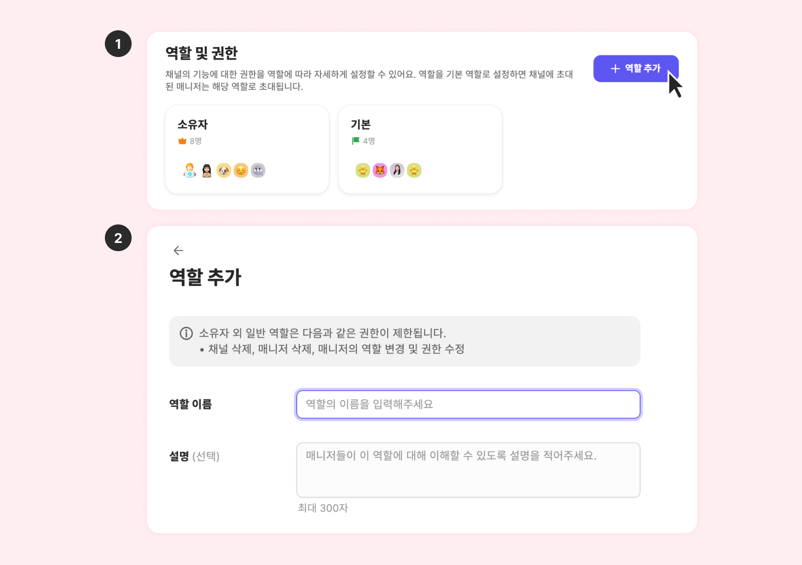 기본 역할: 채널에 초대되면 기본으로 부여되는 역할이에요. 소유자 역할을 제외한 여러 개의 역할 중 하나를 선택하여 기본 역할로 지정할 수 있어요.