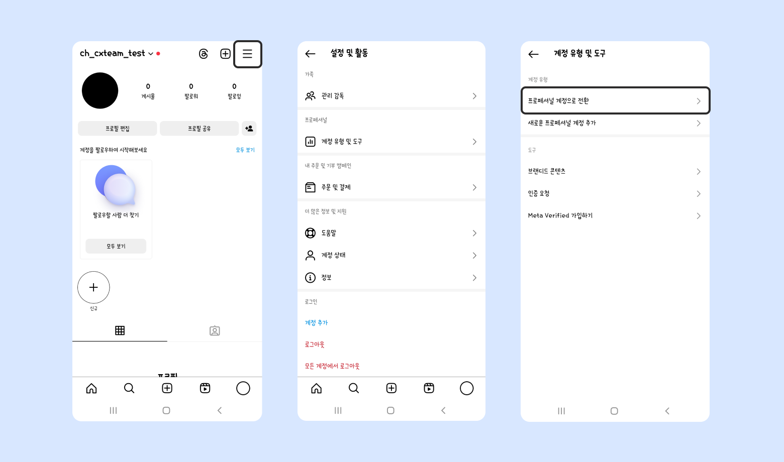 인스타그램 [메뉴] - [설정 및 개인 정보] - [계정 유형 및 도구] - [프로페셔널 계정으로 전환] 을 누르세요. 앱 버전에 따라 [설정 및 개인 정보]가 [설정 및 활동]으로 보일 수 있어요.