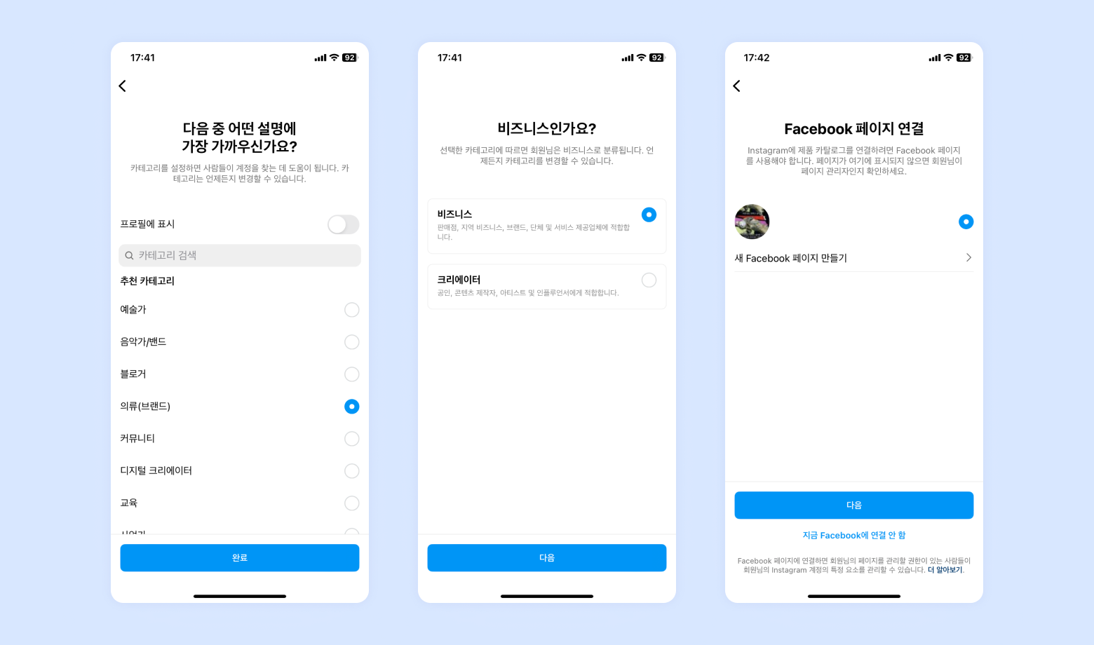 카테고리 선택 및 비즈니스 계정으로 설정, 연락처 정보를 입력하고 새 Facebook 페이지를 만들거나, 이미 생성된 페이지가 있다면 연결하시면 됩니다.