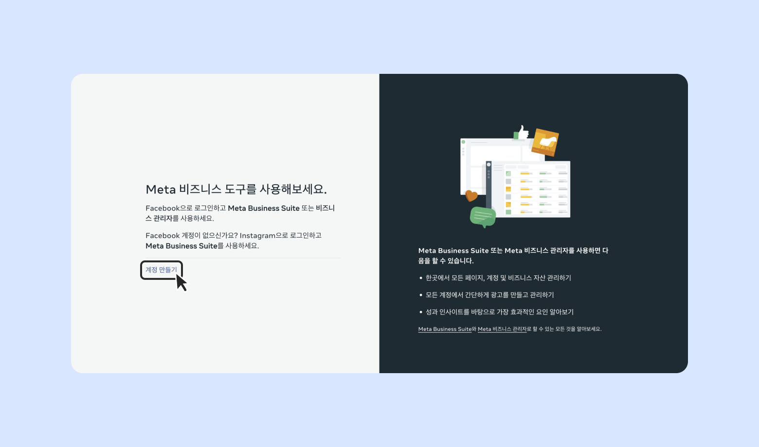 business.facebook.com 에 접속 - [계정 만들기]를 누르세요.