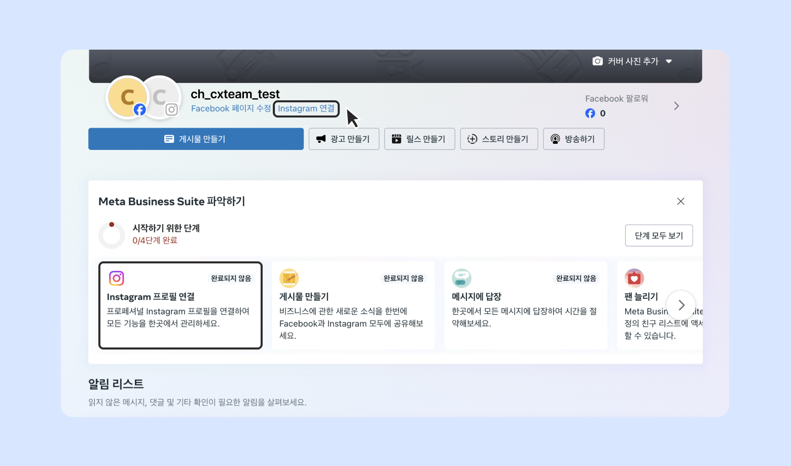 연동할 페이스북 페이지가 없다면 → Facebook 페이지 만들기를 선택하세요