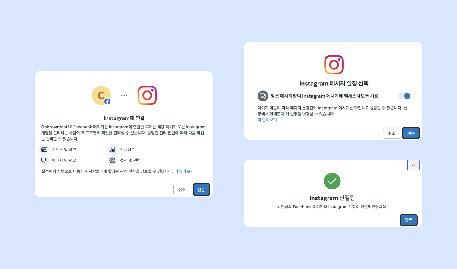 액세스 허용 및 [계속] 버튼 클릭하여 인스타그램 연결을 완료합니다.