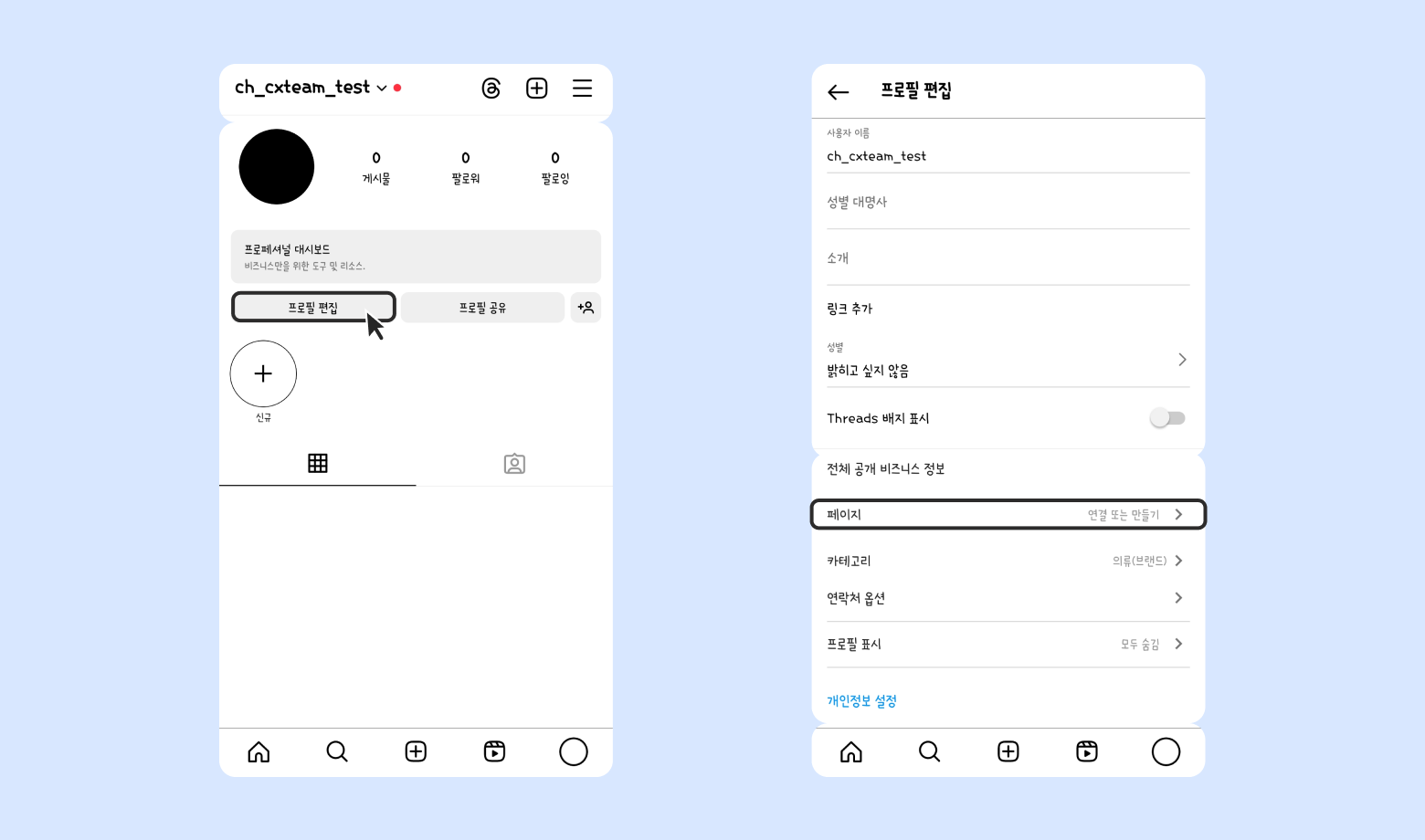 인스타그램 비즈니스 계정으로 접속 후 [프로필 편집]을 누르고, [페이지]에서 페이스북 페이지 연결을 합니다.