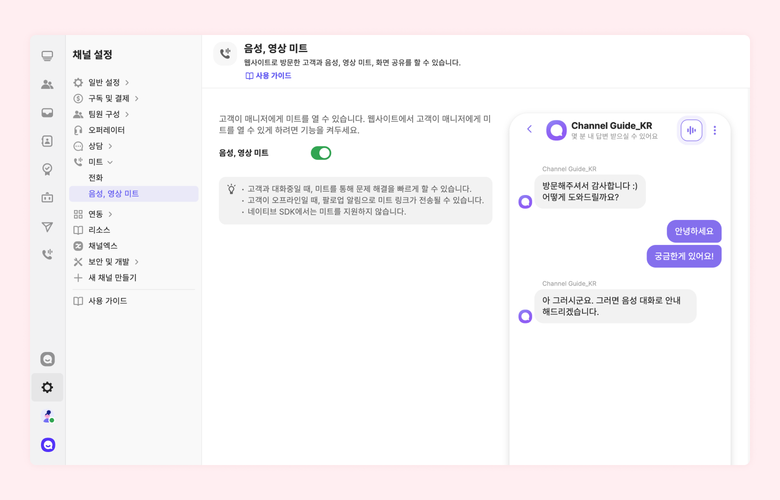 [채널 설정] - [미트] - [음성, 영상 미트]에서 고객이 먼저 팀 멤버에게 음성 미트를 열 수 있도록 설정할 수 있습니다. 설정했을 때 고객의 채팅 화면에서 미트를 열 수 있는 버튼이 표시됩니다.