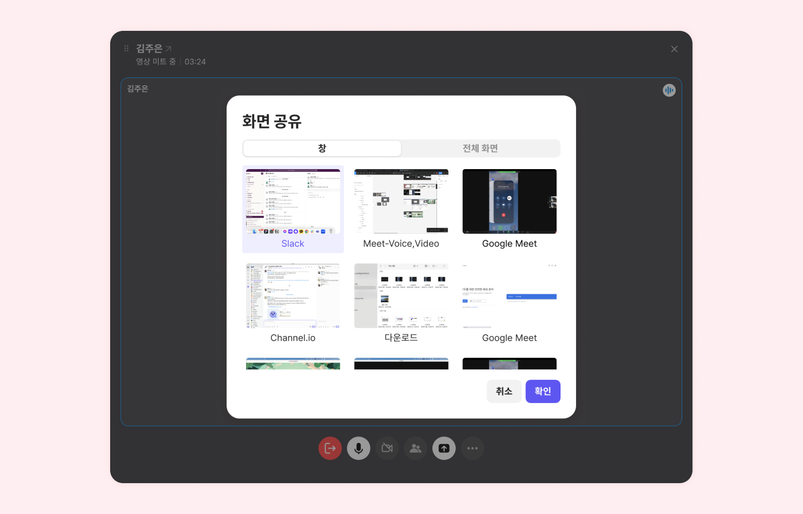 화면 공유: 클릭 시 어떤 화면을 공유할지 선택하는 창이 뜨고, 내 화면을 미트 참여자에게 공유할 수 있습니다.