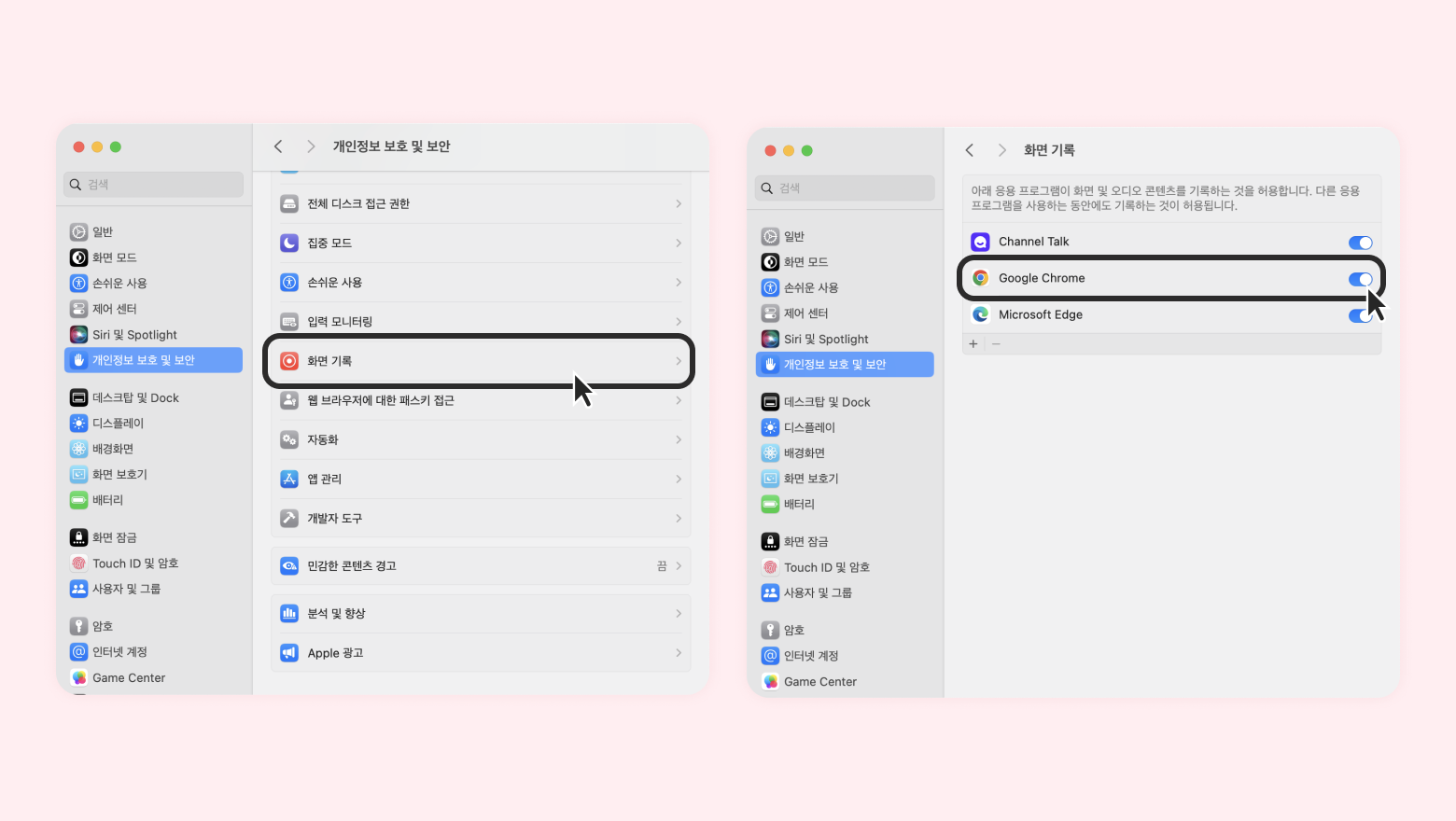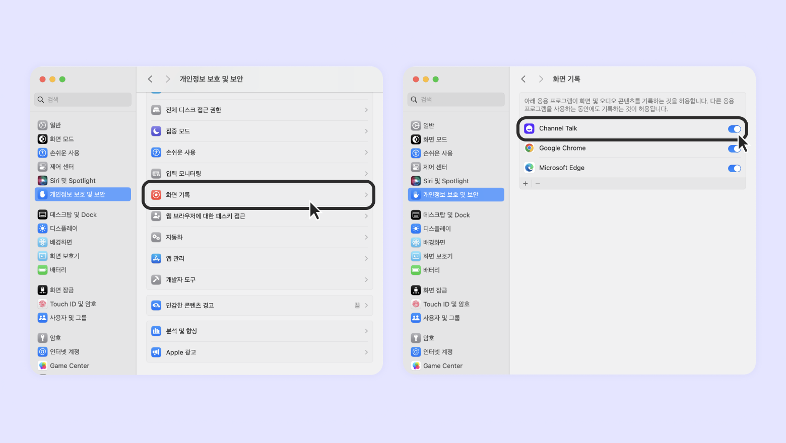 [시스템 환경 설정] - [개인 정보 및 보안] - [화면 기록]에서 Channel Talk 앱의 화면 기록 엑세스를 허용해 주세요.