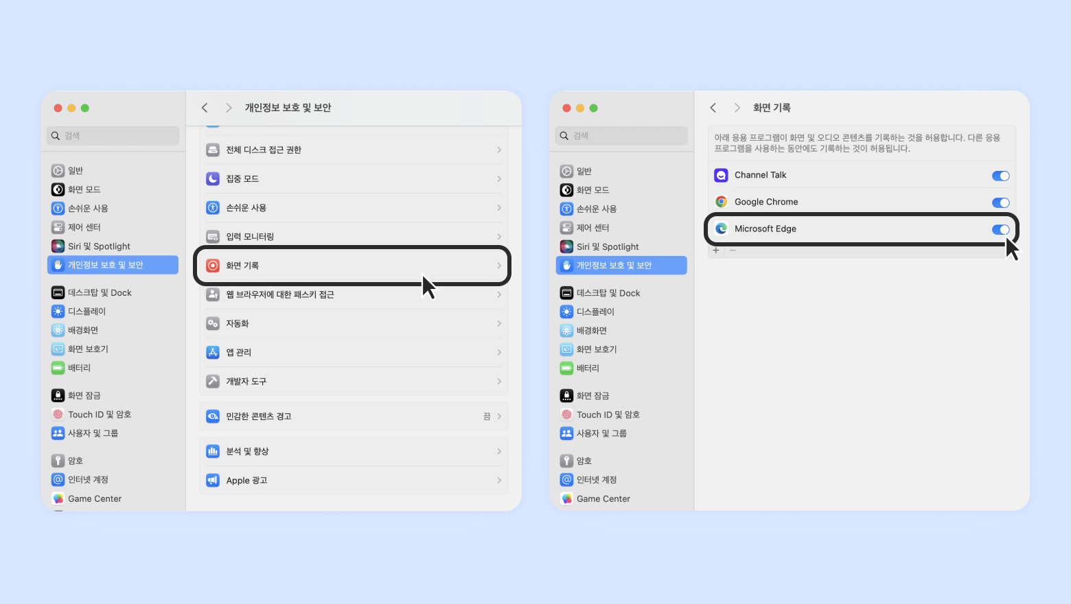 [시스템 환경 설정] - [개인 정보 및 보안] - [화면 기록]에서 Microsoft Edge 앱의 화면 기록 엑세스를 허용해 주세요.