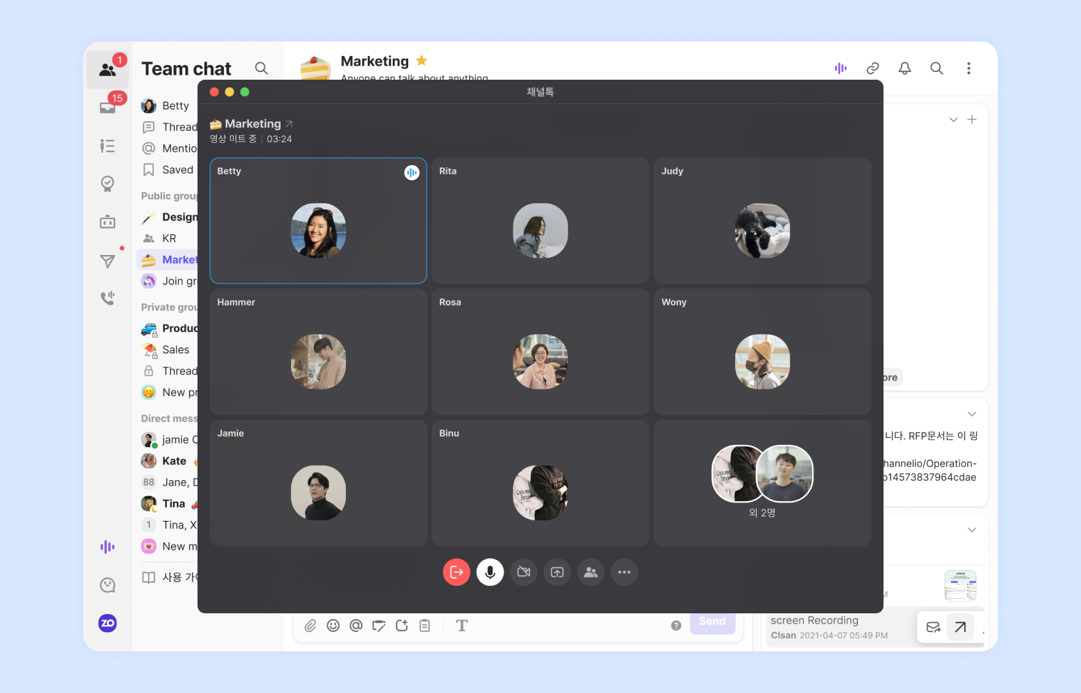 전화로 인입된 고객과 통화 중일 때, 팀 멤버가 영상을 켜더라도 고객은 영상을 볼 수 없습니다. 고객과의 영상 미트는 채널톡 내 [미트] 버튼을 통해서만 가능해요.