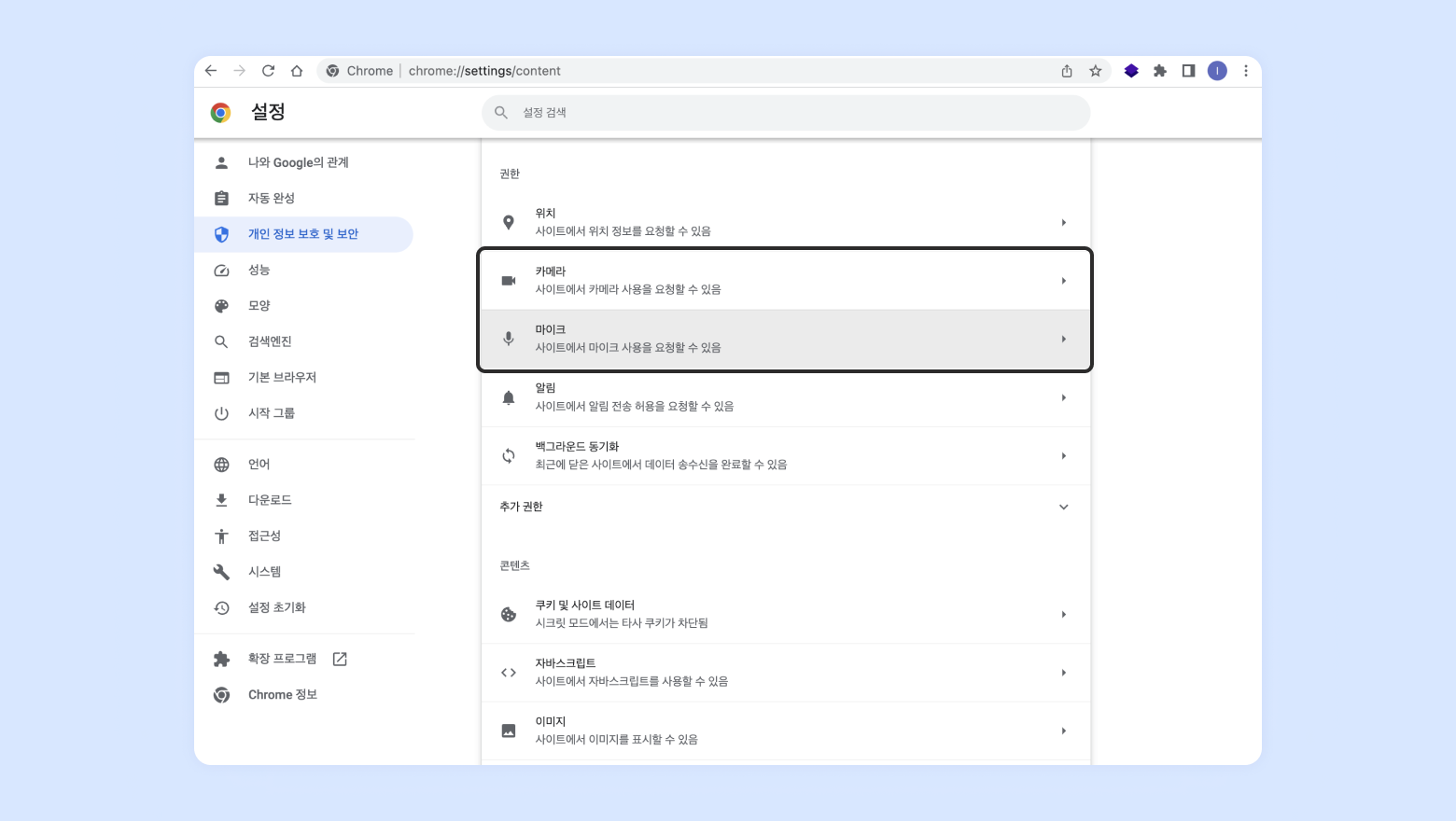 [개인정보 및 보안] - [사이트 설정]에 접속해 주세요.