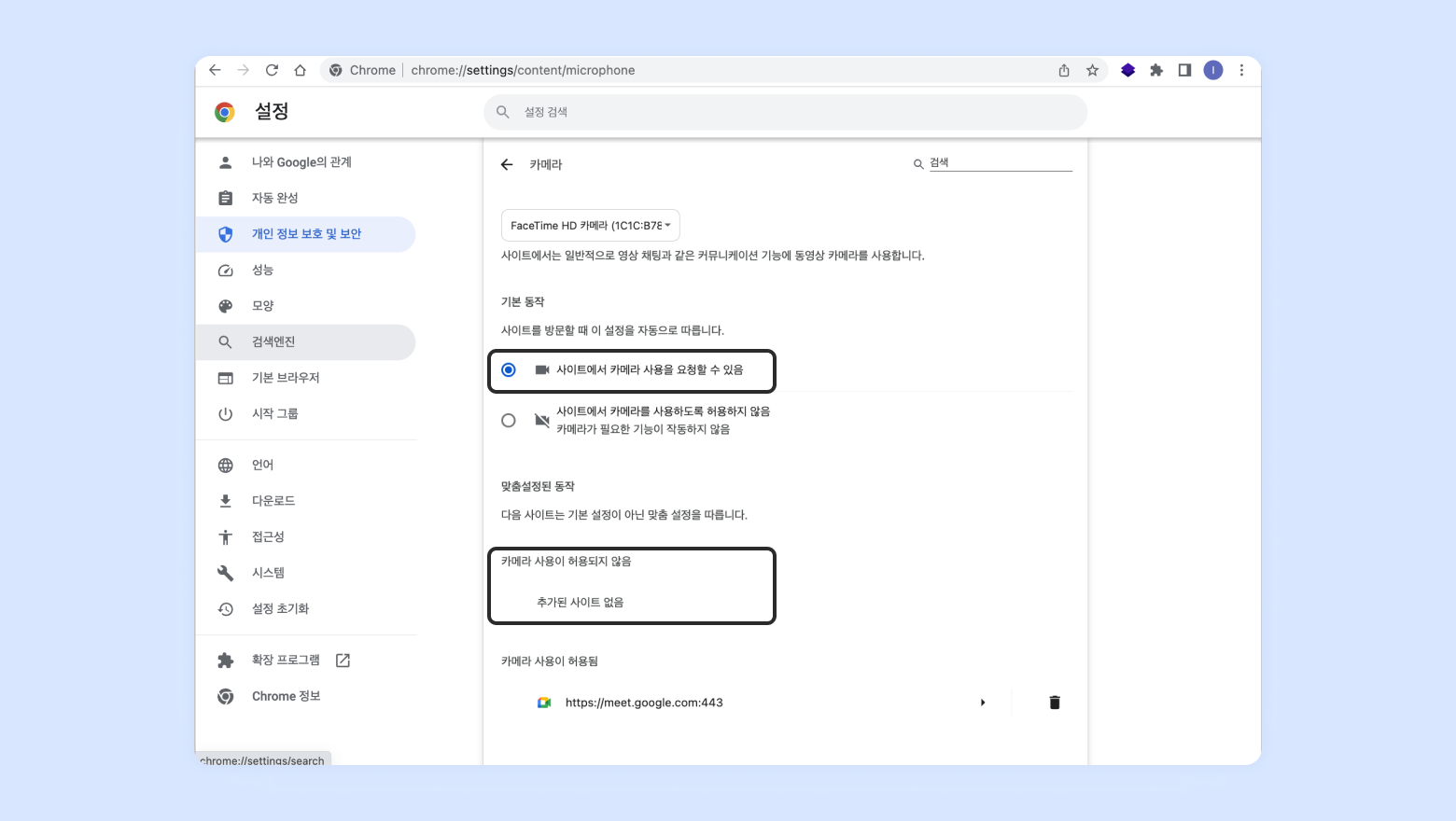 [권한] - [카메라], [마이크]에 각각 접속해 주세요.