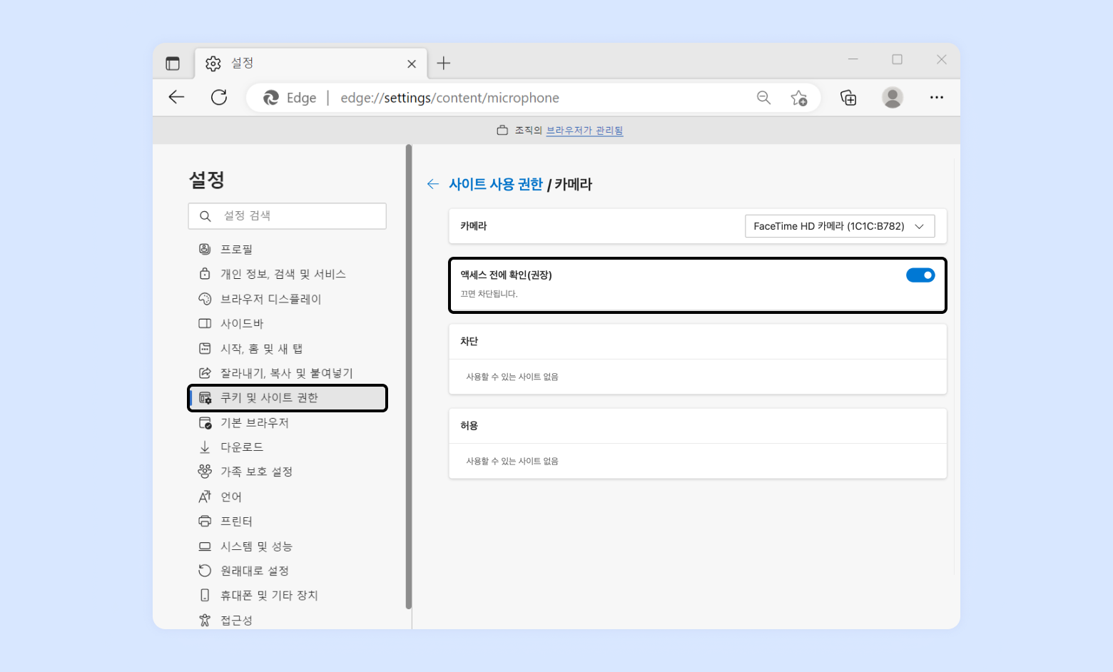 [쿠키 및 사이트 권한] - [카메라], [마이크]로 접속해 각각 [엑세스 전에 확인(권장)] 을 활성화 해주세요.