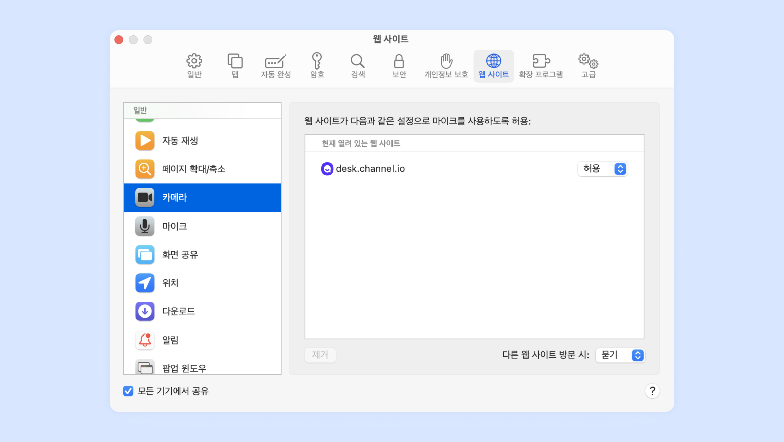 [웹사이트] - [카메라], [마이크]에서 각각 채널톡 주소 (desk.channel.io)에 대해서 권한 허용을 해주세요.