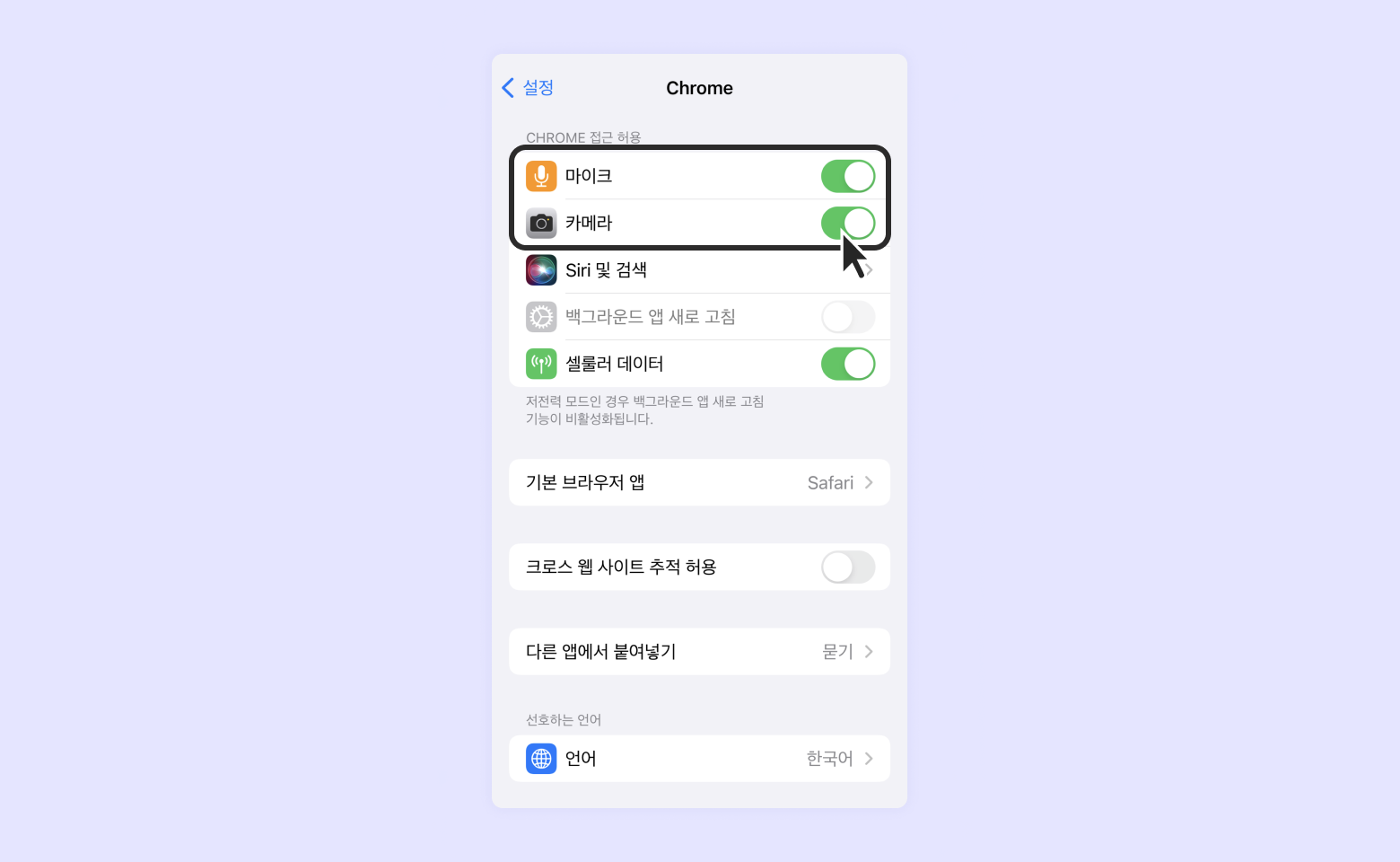 [설정] - [본인이 사용하는 브라우저 앱] 을 선택 후 마이크, 카메라 접근을 허용해 주시고 브라우저 앱으로 다시 접속해 주세요.
