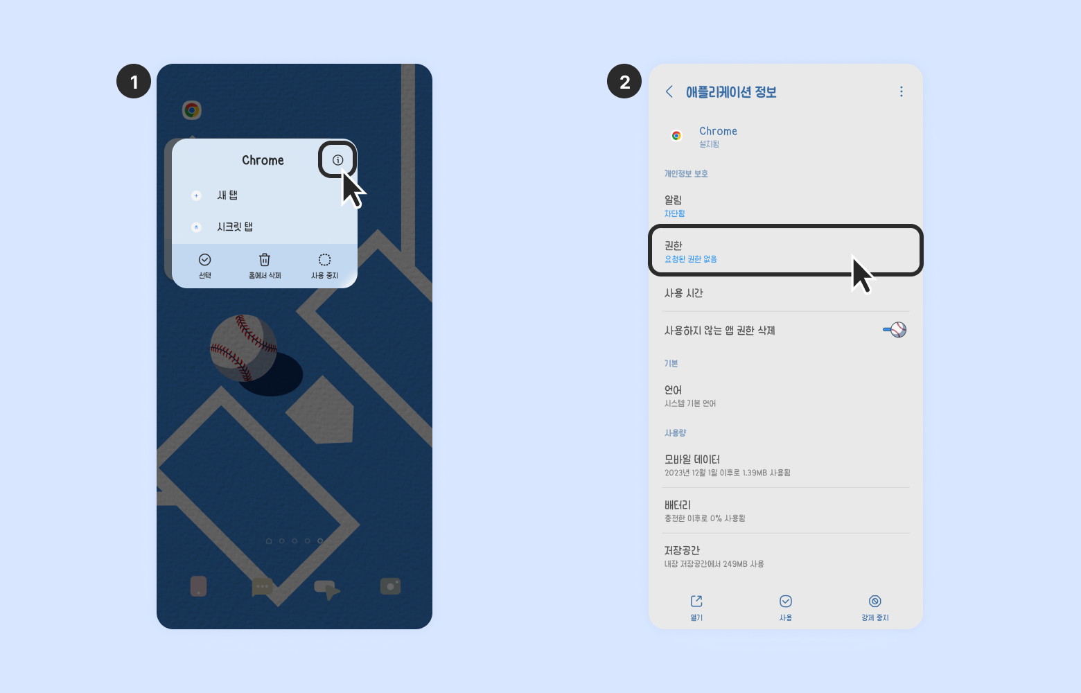 Chrome 앱을 꾹 누르고, 정보 아이콘을 눌러 주세요.