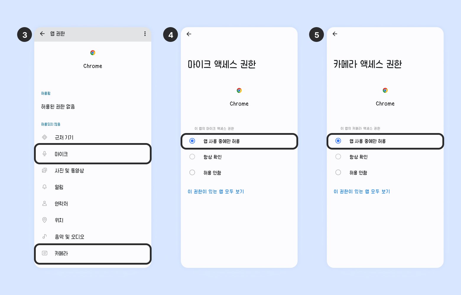 [설정] - [애플리케이션] - [본인이 사용하는 브라우저 앱] - [권한] - [마이크], [카메라]를 선택 후 각각 권한을 허용해 주세요.