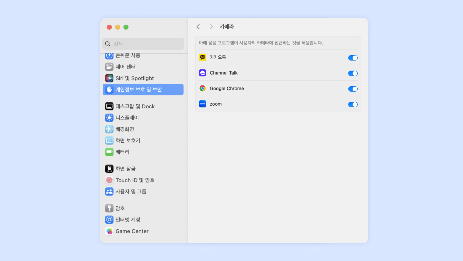 [시스템 환경 설정] - [개인 정보 및 보안] - [마이크], [카메라] 에서 마이크 접근 및 Channel.Talk 앱의 마이크와 카메라 엑세스를 허용해주세요.