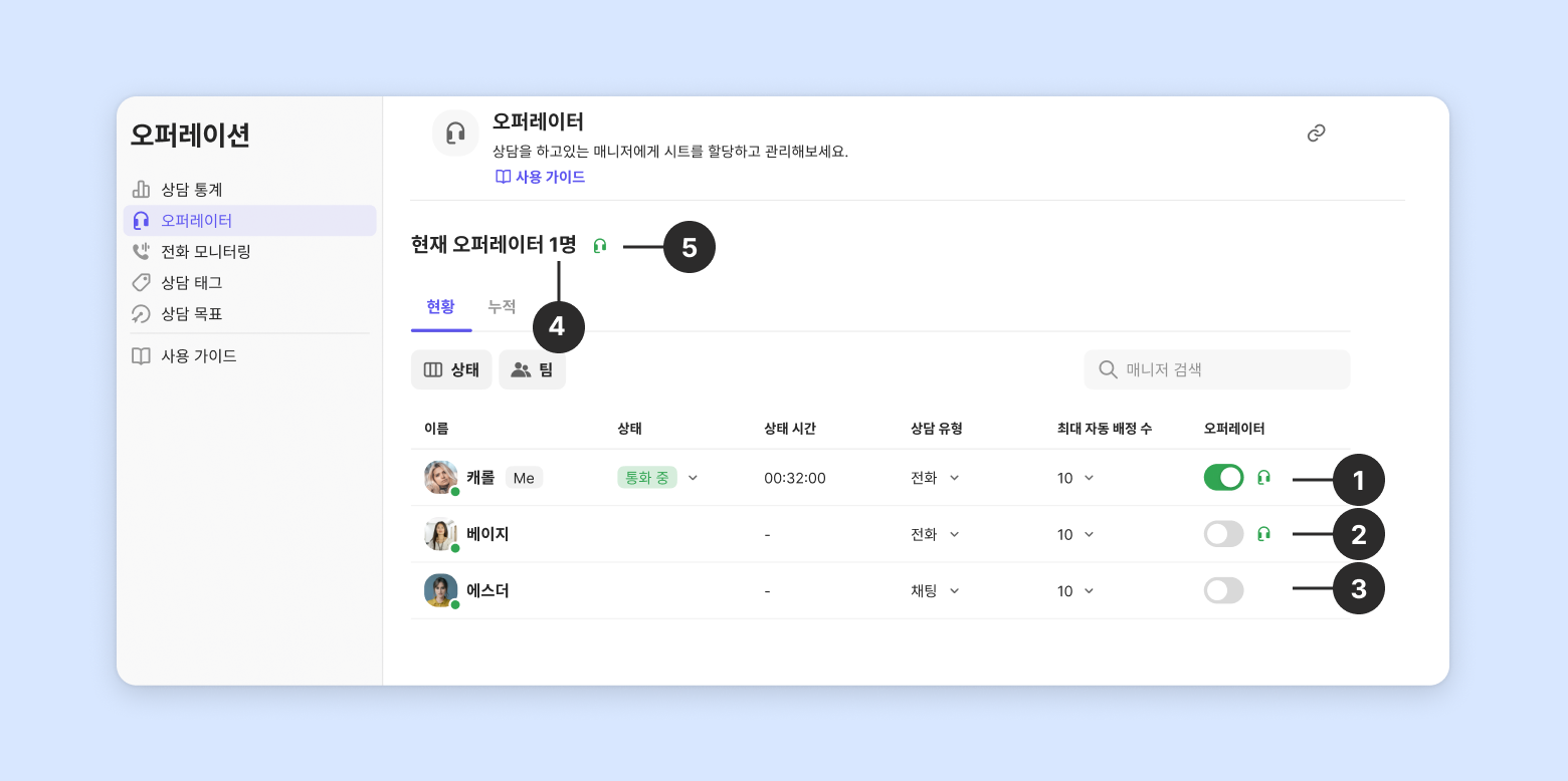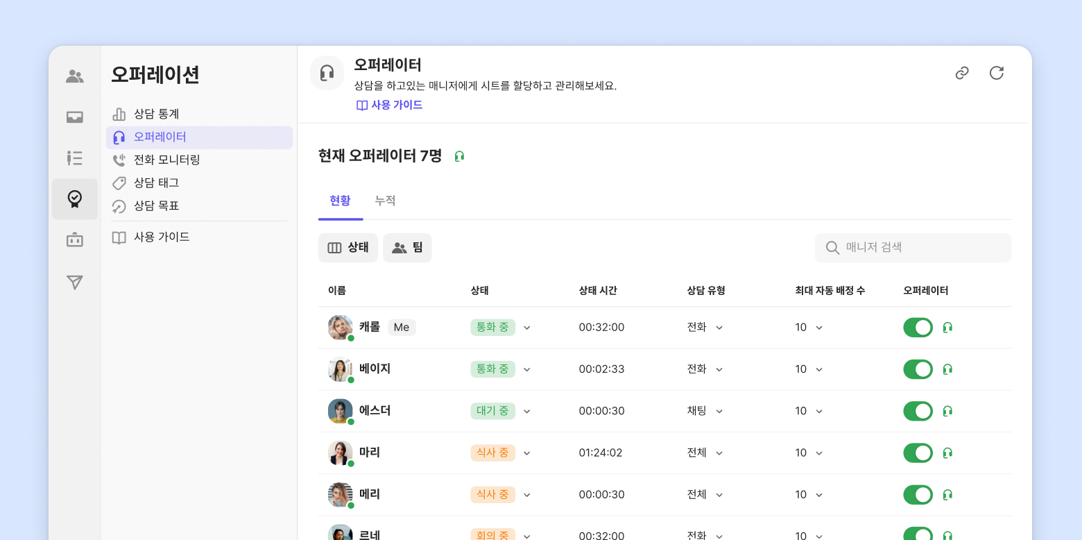 오퍼레이터 상태를 통해 팀 멤버의 상태와 상담 가능 여부를 한눈에 파악할 수 있어요.