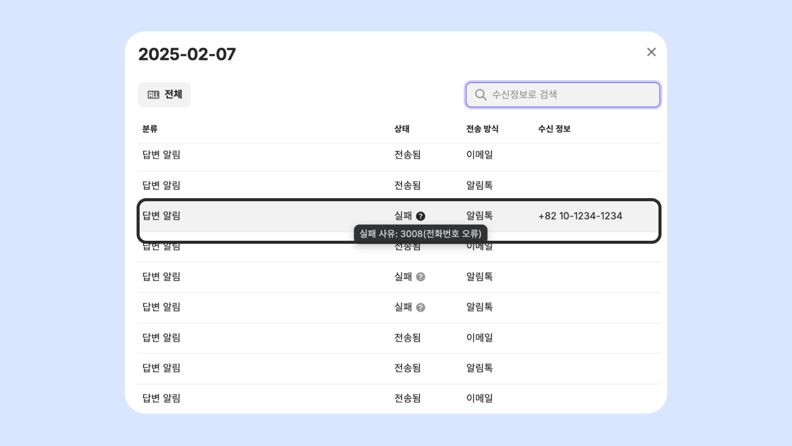 상태 : 전송 여부를 확인하실 수 있어요. 실패 사유는 오른쪽 물음표에 마우스를 올리면 확인하실 수 있습니다.