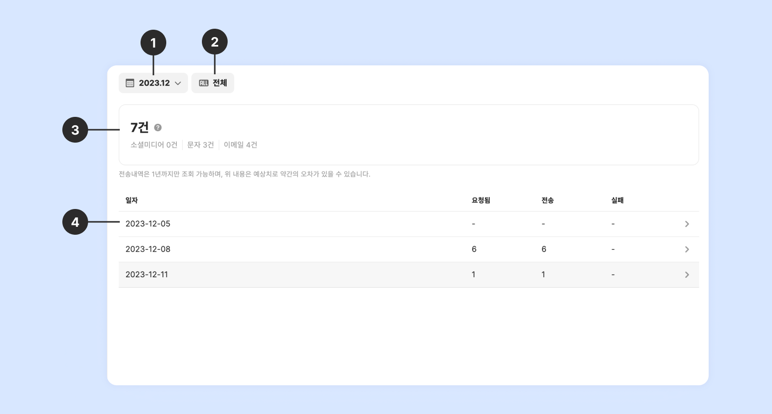 일자별 전송 내역 : 일자를 클릭하면, 해당 일자의 전송 내역을 자세히 확인할 수 있어요.