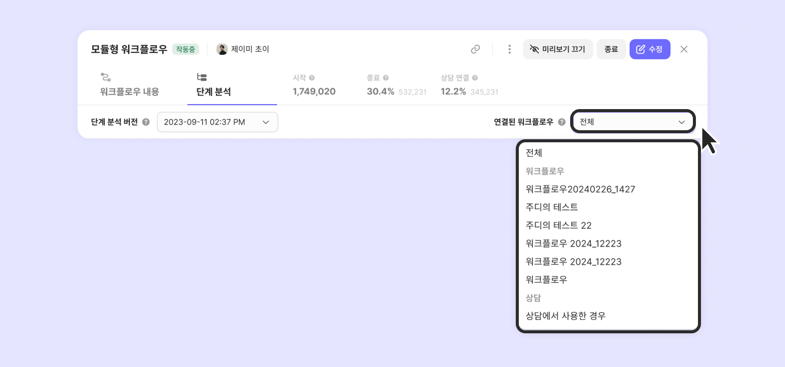모듈형 워크플로우라면, 연결된 워크플로우에 따른 단계 분석을 조회할 수 있습니다. 우측 ‘연결된 워크플로우’에서 조회하고자 하는 워크플로우를 선택해 주세요.