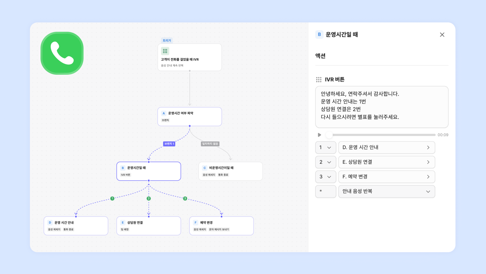 고객이 전화를 걸었을 때 음성 응답 설정을 통해 간단한 질문에 대한 답변은 상담원 연결없이 음성 메시지로 안내할 수 있어요.