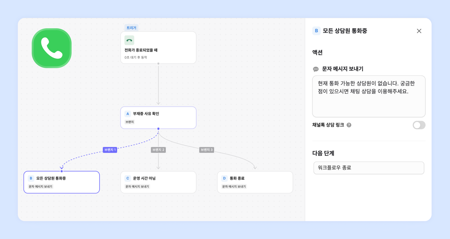 부재중 전화일 때, 운영시간이 아닐 때, 전화 통화 후 종료되었을 때, 각각 상황에 맞게 고객에게 자동으로 메시지를 보낼 수 있어요.
