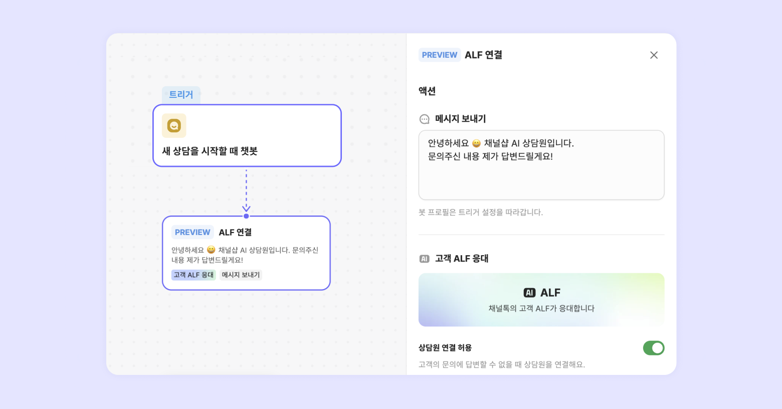 카카오 상담톡, 네이버 톡톡과 같은 외부 메신저로 들어온 상담에도 채널톡 고객 ALF가 응대할 수 있어요.등록된 FAQ와 도큐먼트를 기반으로 고객 ALF가 상담원 대신 답변할 수 있도록 설정해보세요.