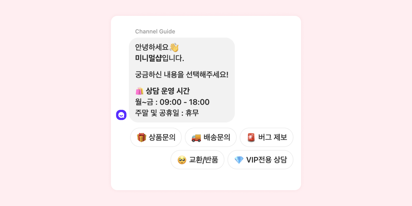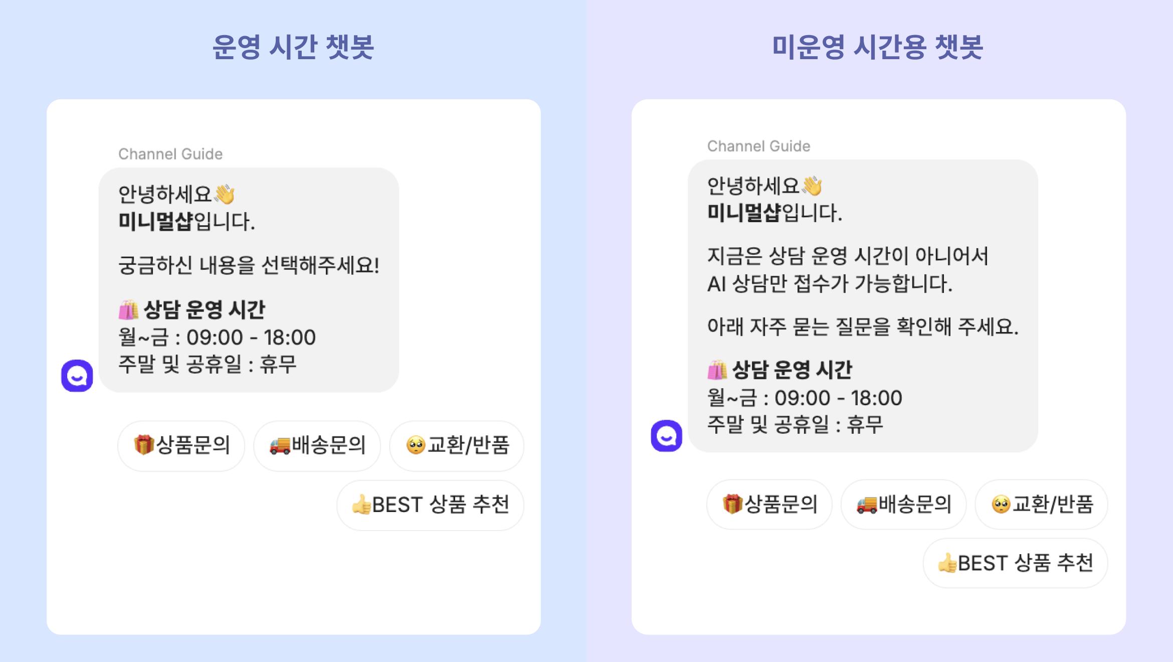 시작 화면에서 운영 시간을 안내하여 비운영 시간(부재중)에는 담당자와의 상담이 어려운 점을 인지하도록 안내할 수 있어요.