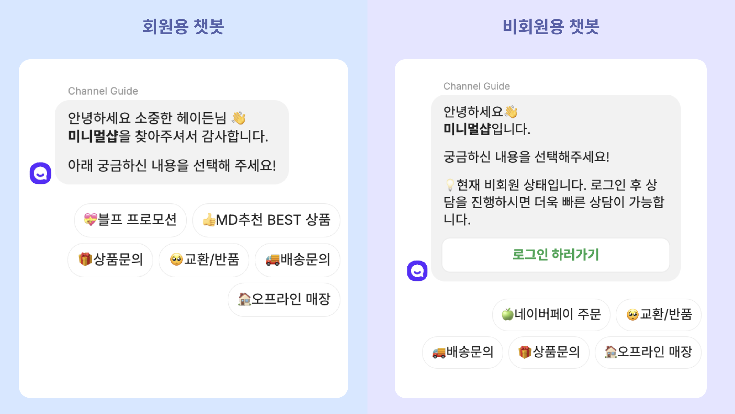 회원과 비회원 고객에게 보여지는 문의 유형을 다르게 구성할 수 있어요. 비회원 고객의 경우 로그인 후 상담을 진행할 수 있도록 안내해 주세요.