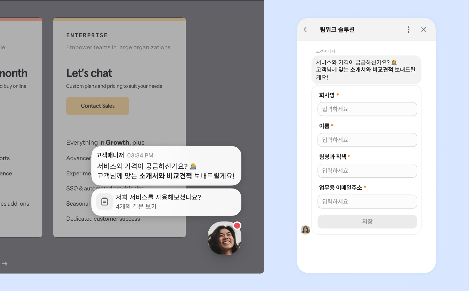 팀 멤버가 답변을 보낸 후 고객이 답장이 없을 경우 추가 문의가 없는지 다시 질문해 보세요. 고객이 상담 내용을 놓치지 않도록 리마인드 알림을 드려 상담 경험을 챙길 수 있어요.