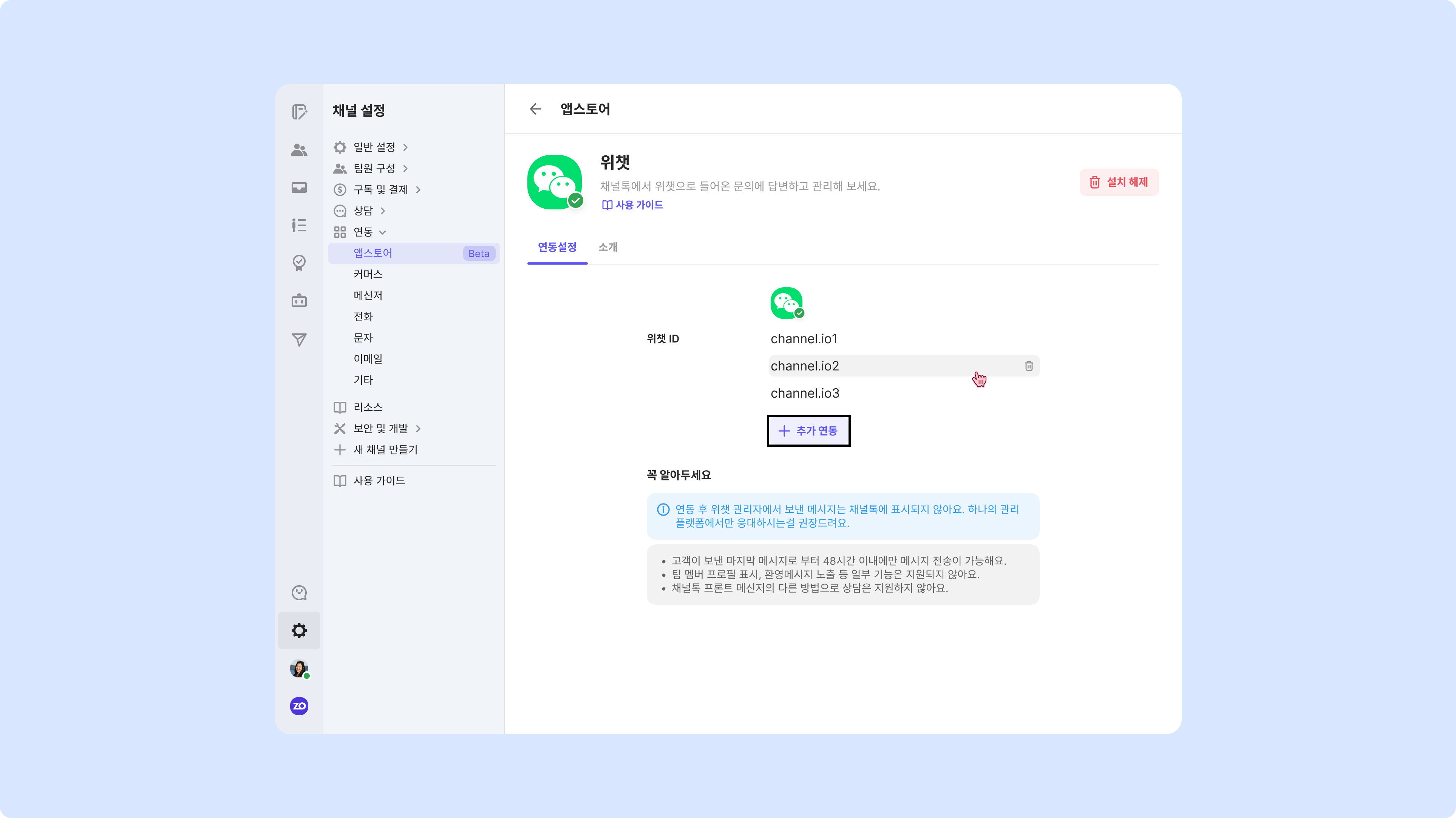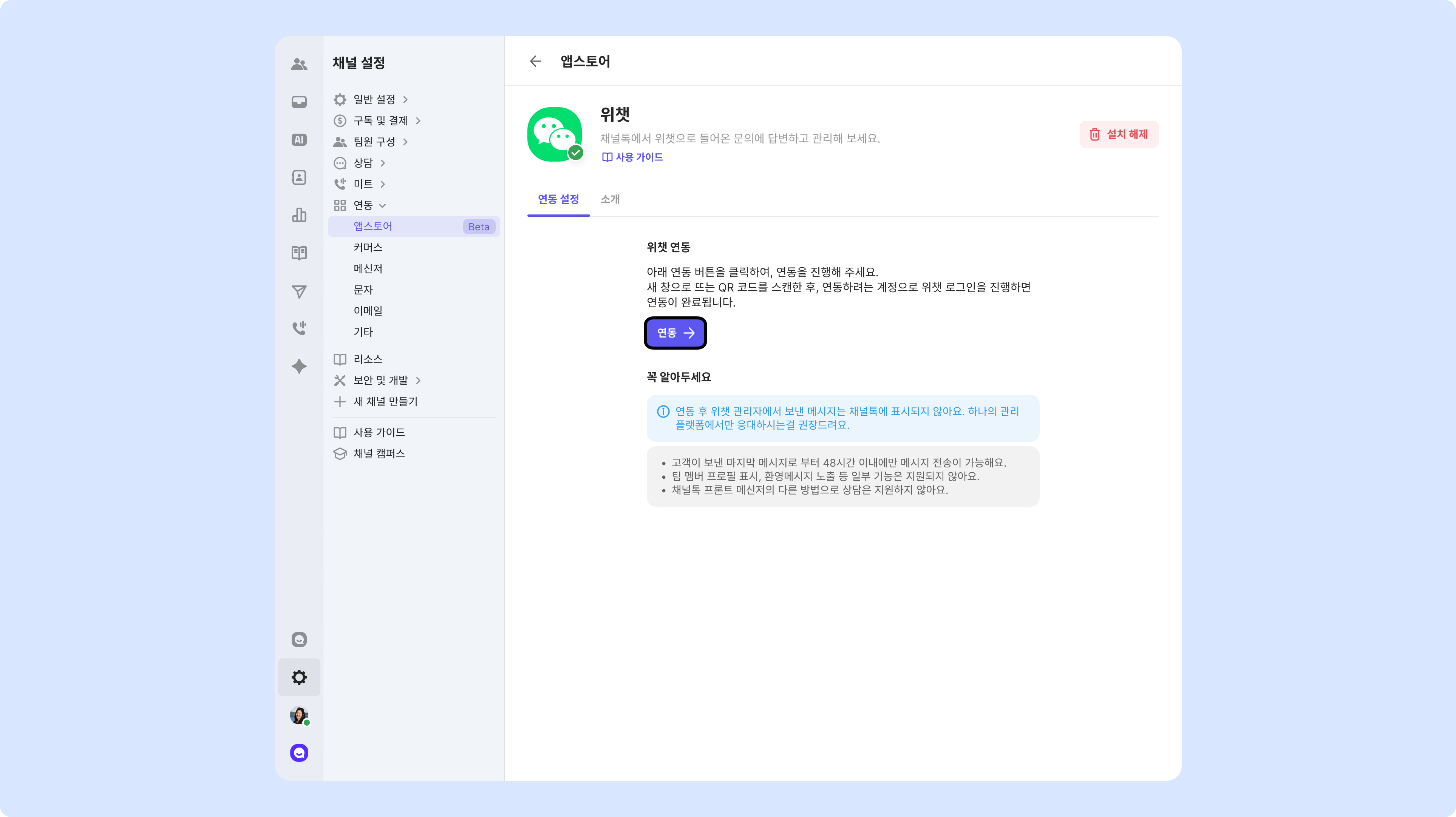 [채널 설정] - [연동] - [앱스토어] - [위챗] → [설치하기] 를 클릭 해주세요.