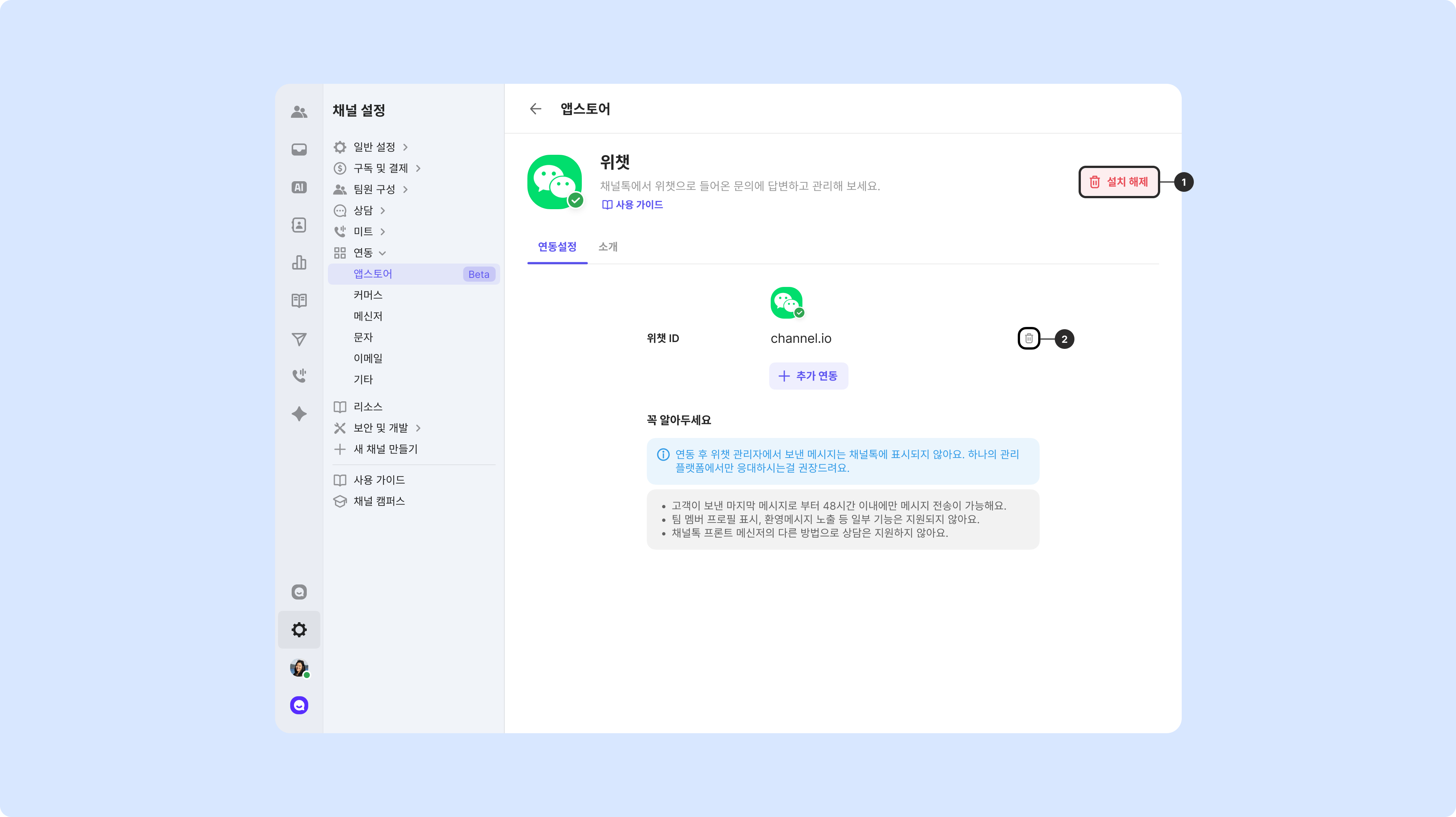 [채널 설정] - [연동] - [앱스토어] - [위챗] 메뉴에서 ❶ 설치를 해제하거나 ❷연동된 ID를 삭제할 수 있습니다.