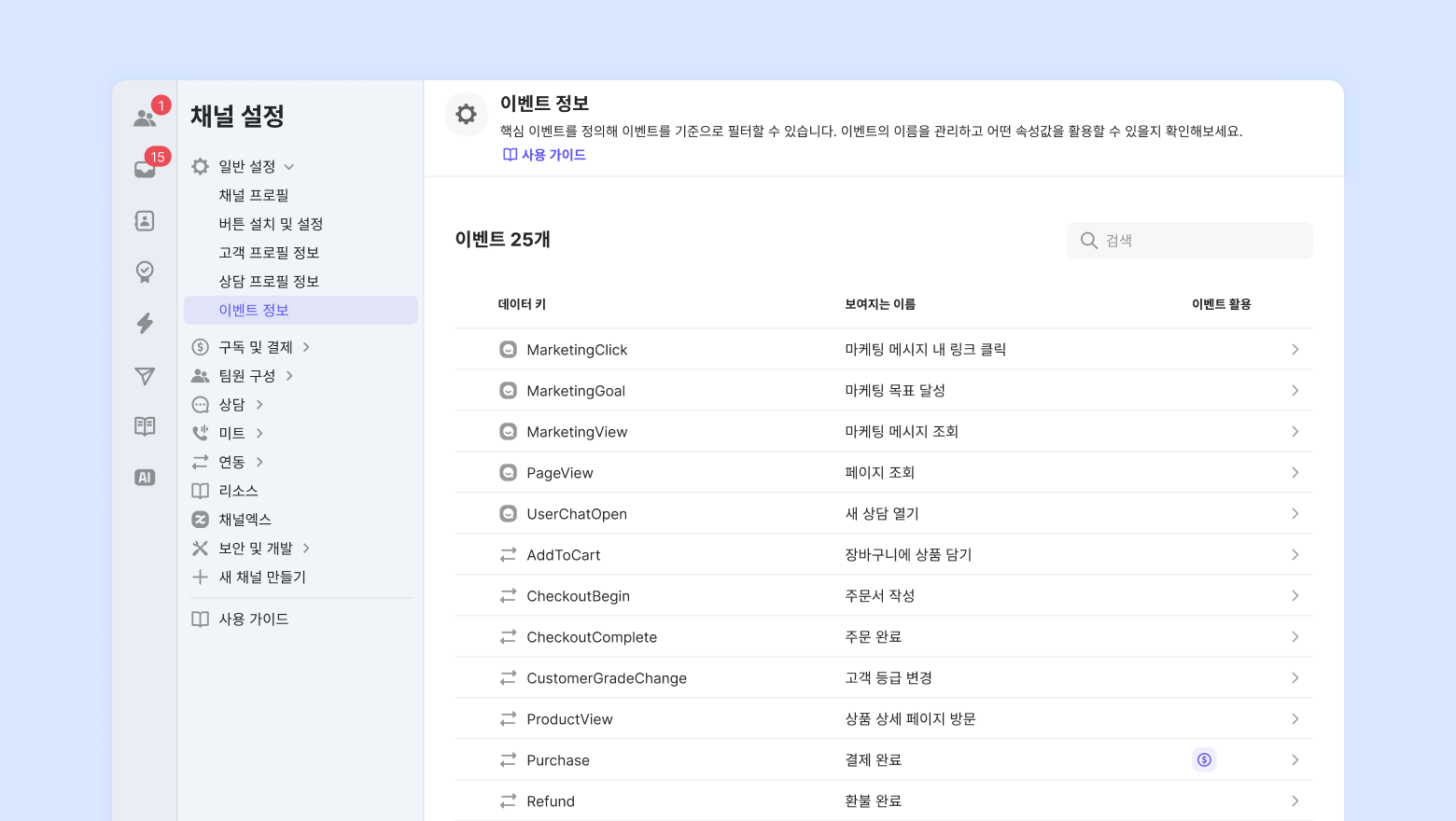 채널톡에서 기본적으로 제공되는 이벤트 정보입니다. 기본 연동 정보는 수정할 수 없어요.