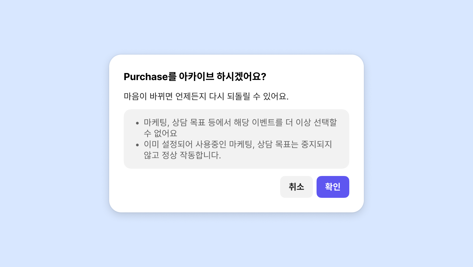 더 이상 사용하지 않는 이벤트는 아카이브를 통해 숨김처리하여 이벤트 목록을 깔끔하게 관리할 수 있어요. 아카이브 된 이벤트는 언제든 다시 되돌려 사용할 수 있습니다.