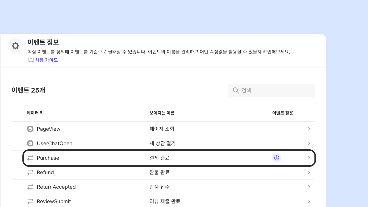 채널톡이 설치된 사이트에서 발생되는 고객 행동을 이벤트로 정의하고 채널톡에 연동하여 활용할 수 있어요. 이벤트는 마케팅, 상담 목표 설정 시 활용 가능합니다.