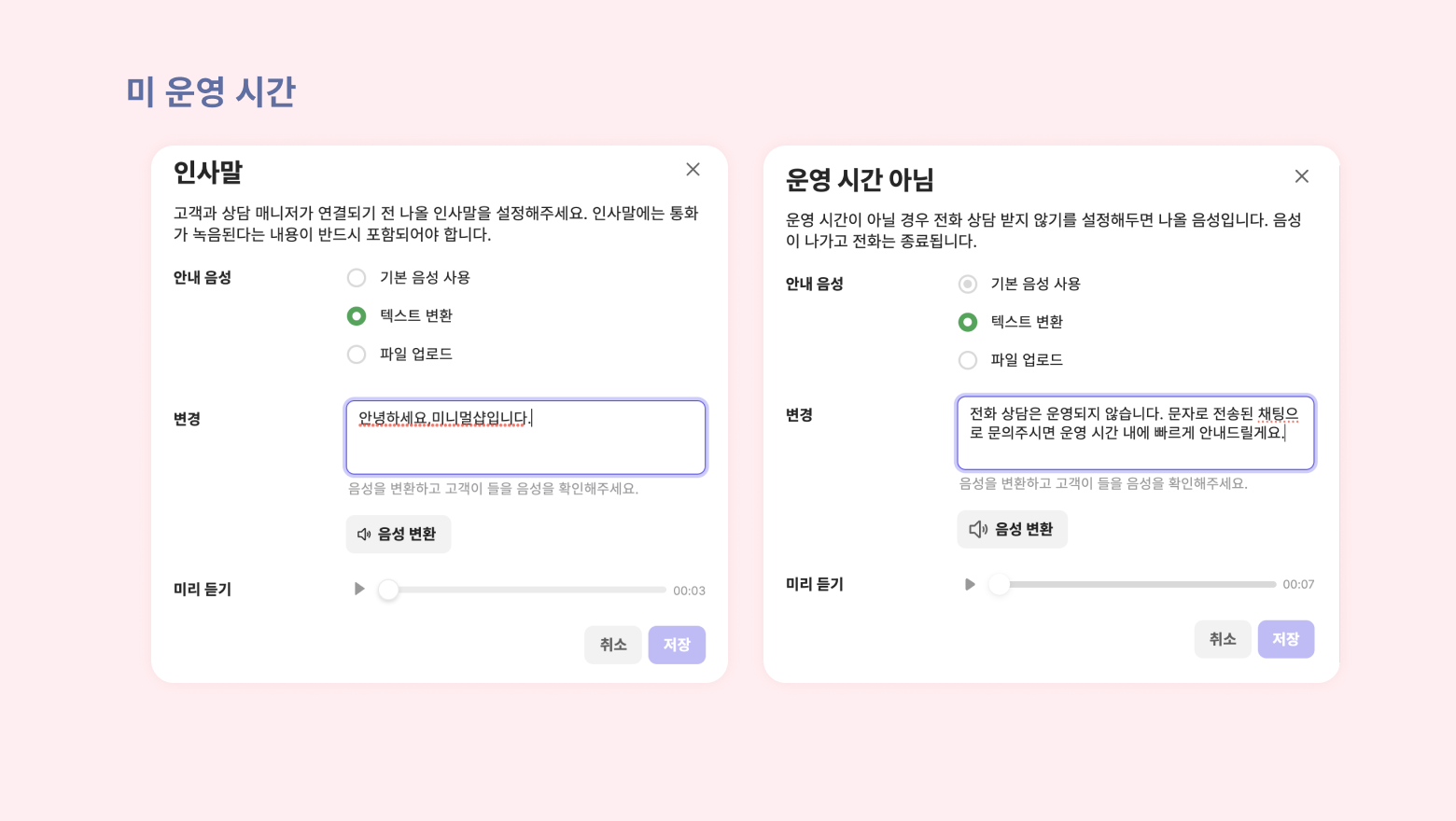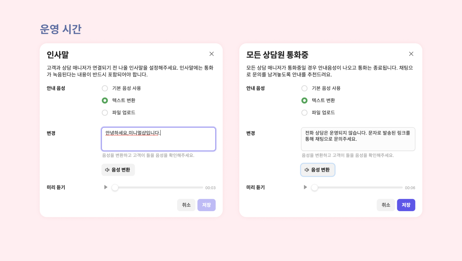 고객에게 전화 상담은 운영 되지 않음을 안내하기 위해, 안내 음성을 설정해주세요. 이 때, 운영 시간과 미 운영 시간은 설정이 달라지니 이미지를 참고해주세요.