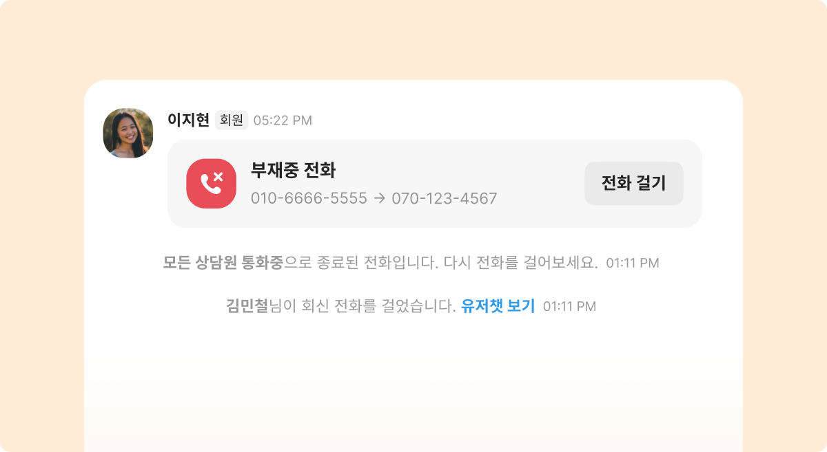 부재중 전화 상담창 안의 ‘전화 걸기’ 버튼을 눌러 전화를 걸면, 해당 상담창에서 부재중 전화를 시도한 담당자의 콜백 이력이 남아요.