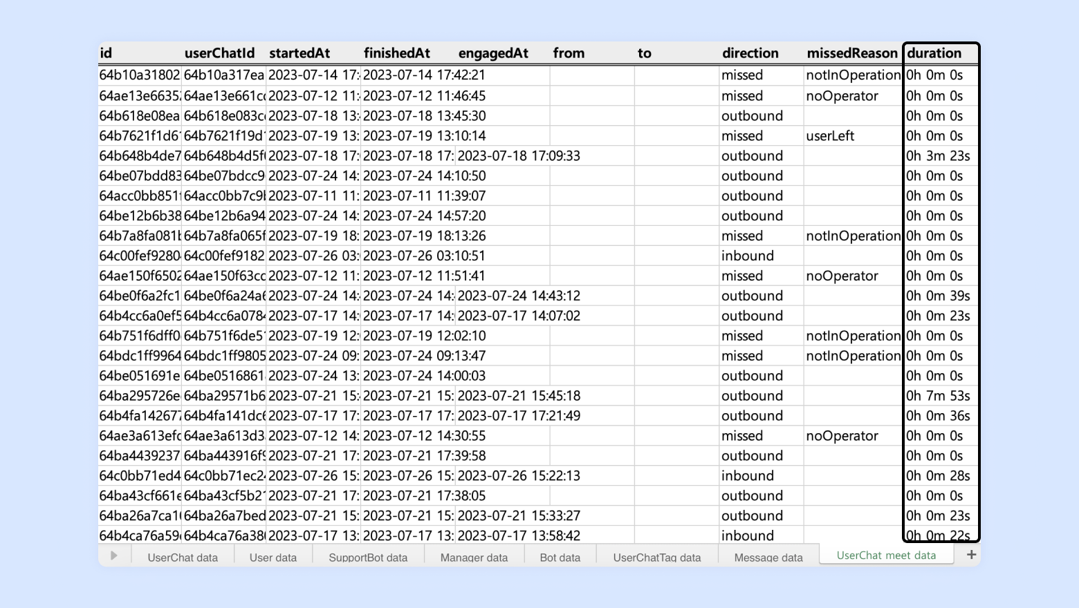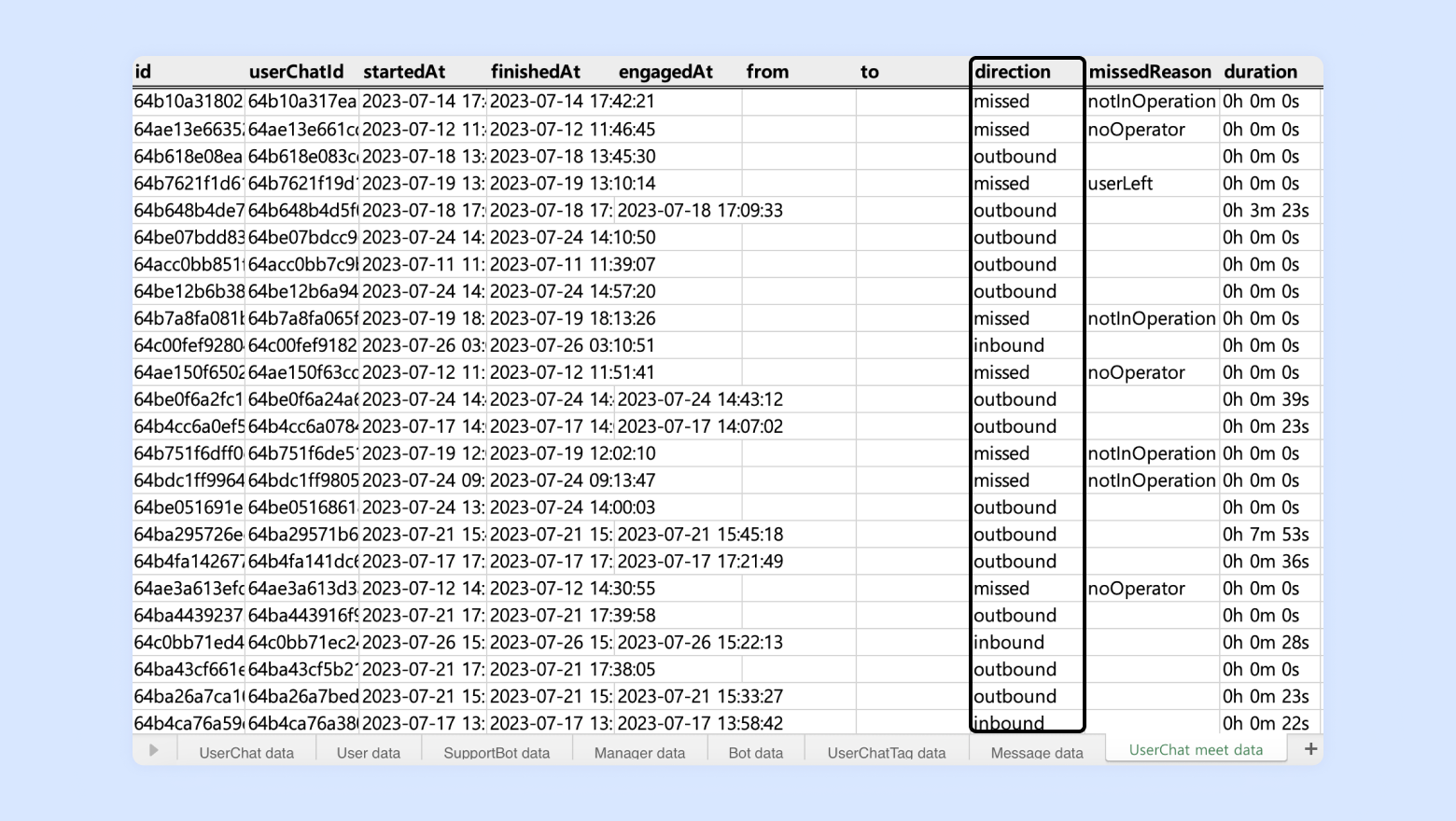 direction 컬럼에서 인/아웃바운드 콜 구분 확인 가능