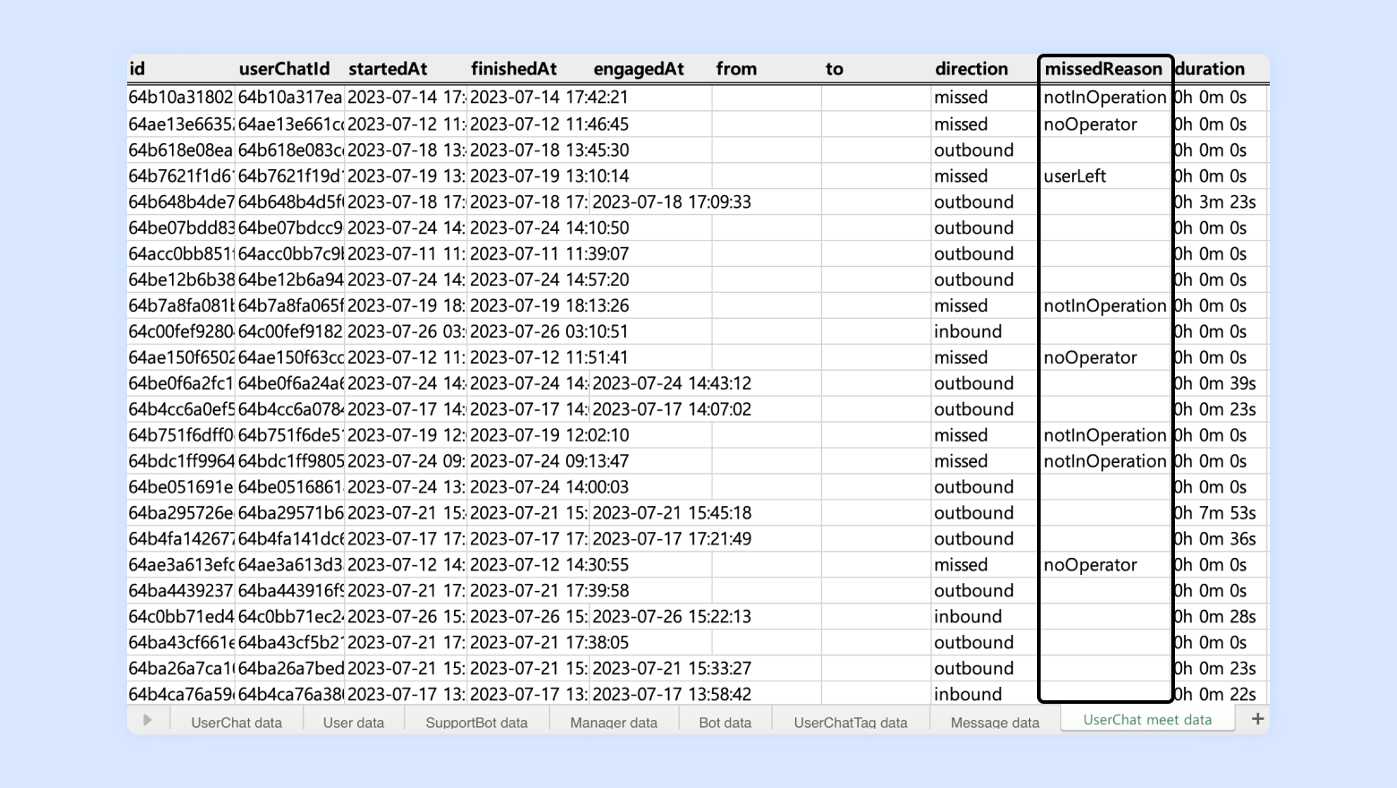 missedReason 컬럼에 사유가 찍혀있다면 부재중 콜