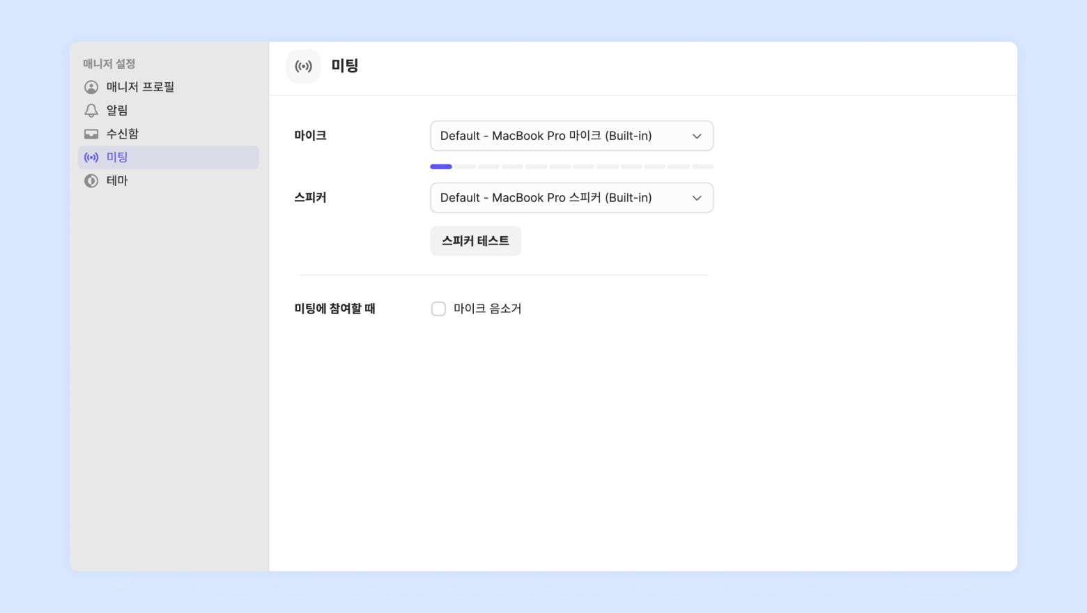 채널톡 데스크 [개인 설정] - [팀 멤버 설정] - [미트]에서 마이크와 스피커 장치로 헤드셋 기기 선택이 동시에 불가