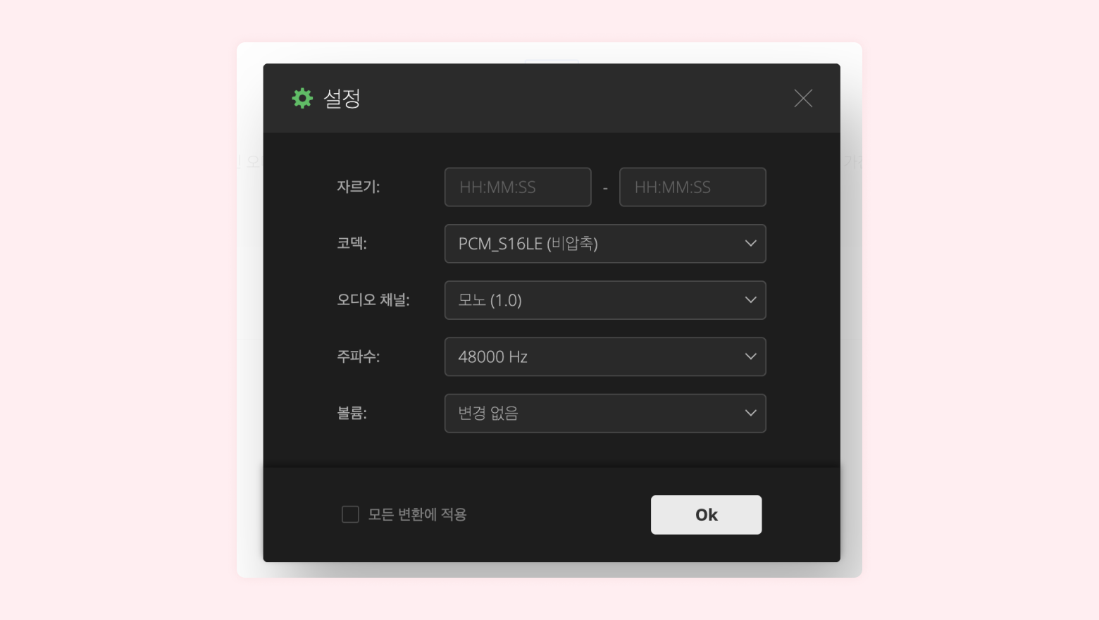 톱니바퀴 설정 클릭 후 → 오디오채널 : 모노(1.0), 주파수 48000 Hz 로 설정